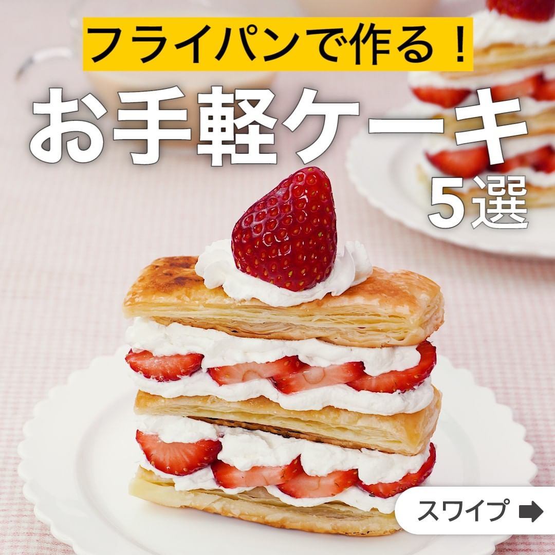 お家で手軽に作れるミルフィーユのご紹介です。冷凍パイシートをフライパンでサクッとするまで焼きましょう!あとはいちごとホイップクリームを挟めば出来上がり♪おやつにぴったりです。