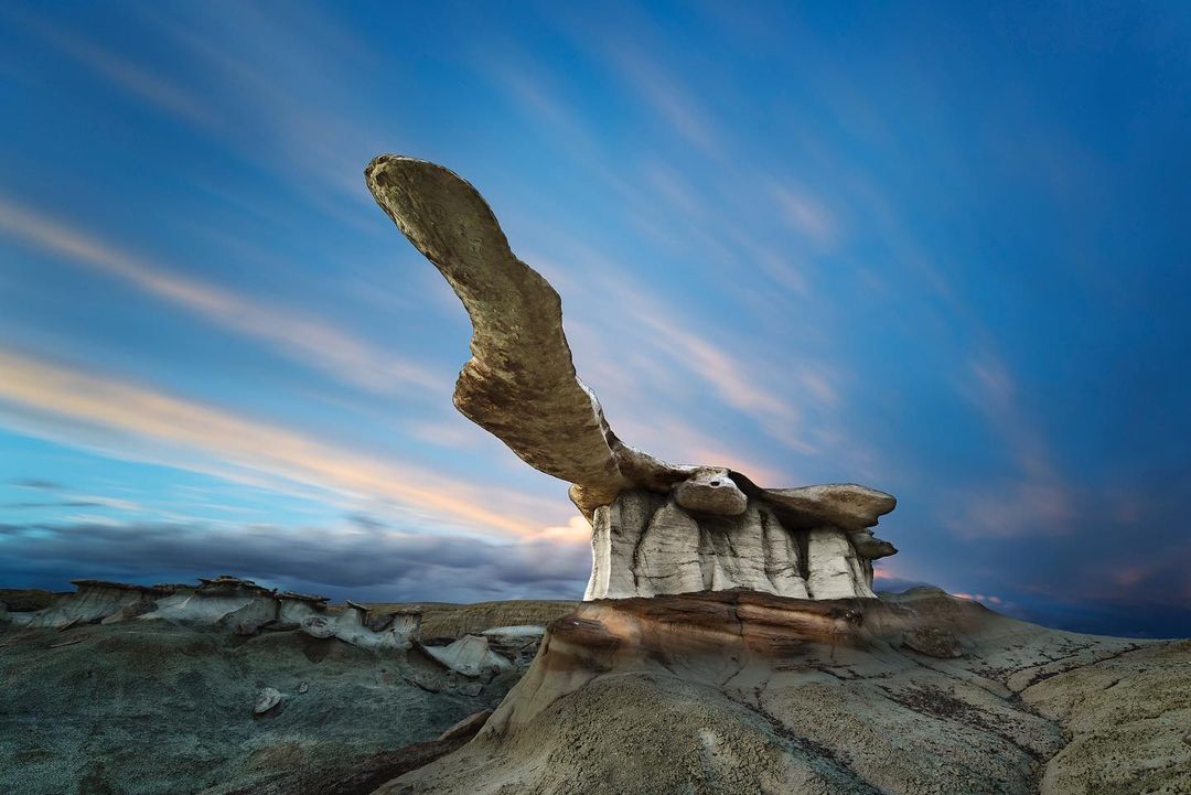 Photo by @j.rog.photo: “The King of Wings defies gravity in the Ah-Shi-Sle-Pah Wilderness study area in northwestern New Mexico. Located between Chaco Culture National Historical Park and the Bisti Badlands, King of Wings is one of thousands of rock hoodoos scattered about the dry washes of this high desert plateau.