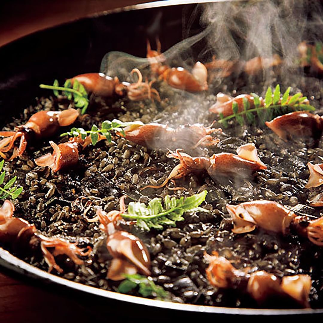 写真①風味豊かな「蛍烏賊とイカスミのパエリア」