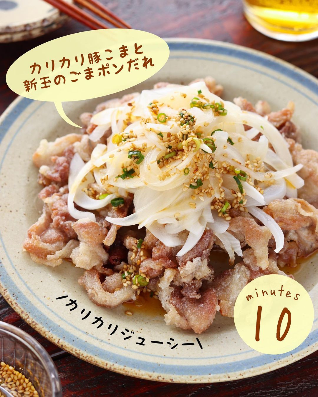 𓎩 #カリカリ豚こまと新玉のごまポンだれ