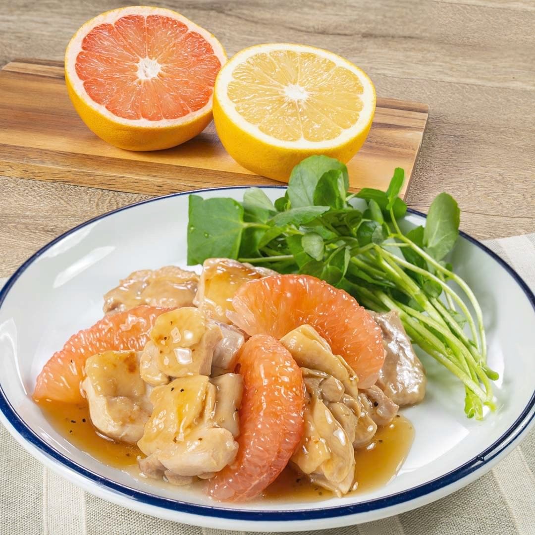 グレープフルーツが爽やかに香る、チキンソテーのご紹介です。「フロリダ グレープフルーツ ホワイト」の柑橘の香りと、しょうゆ、はちみつの甘じょっぱいソースが鶏肉に絡み、やみつきになるおいしさですよ。苦味がほとんどなく、甘味と酸味のバランスが良い「フロリダ グレープフルーツ ルビー」と一緒に食べると、フレッシュでみずみずしく、爽やかなチキンソテーを楽しんでいただけます。ぜひお試しくださいね。