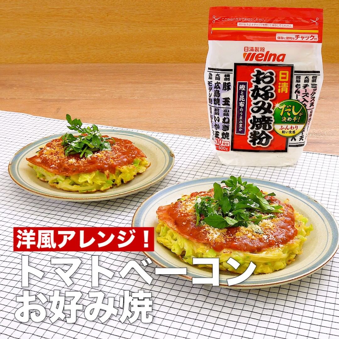うまみ豊かなふっくらお好み焼とミートソースのコクがマッチし、大人もお子さまも楽しめる味わいです!「日清 お好み焼粉」と「マ・マー トマトの果肉たっぷりのミートソース」は日清製粉ウェルナが提供する商品です。ぜひお試しください!