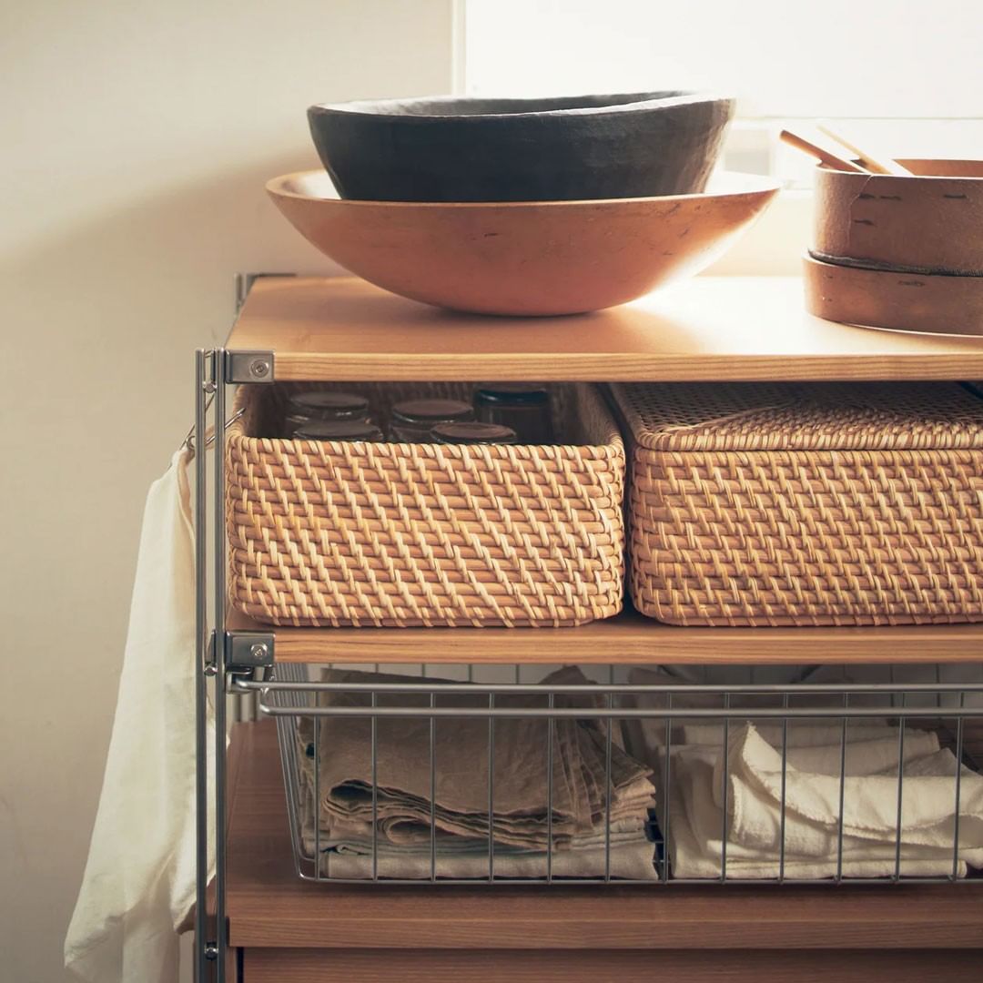 『重なるラタン長方形バスケット』と『重なるブリ材長方形バスケット』は、どちらも自然の風合いを生かすため、無塗装で仕上げました。リビングやキッチンなどで使う、雑多なものや目隠ししたいものをバスケットにしまうと、見た目に統一感が出せます。