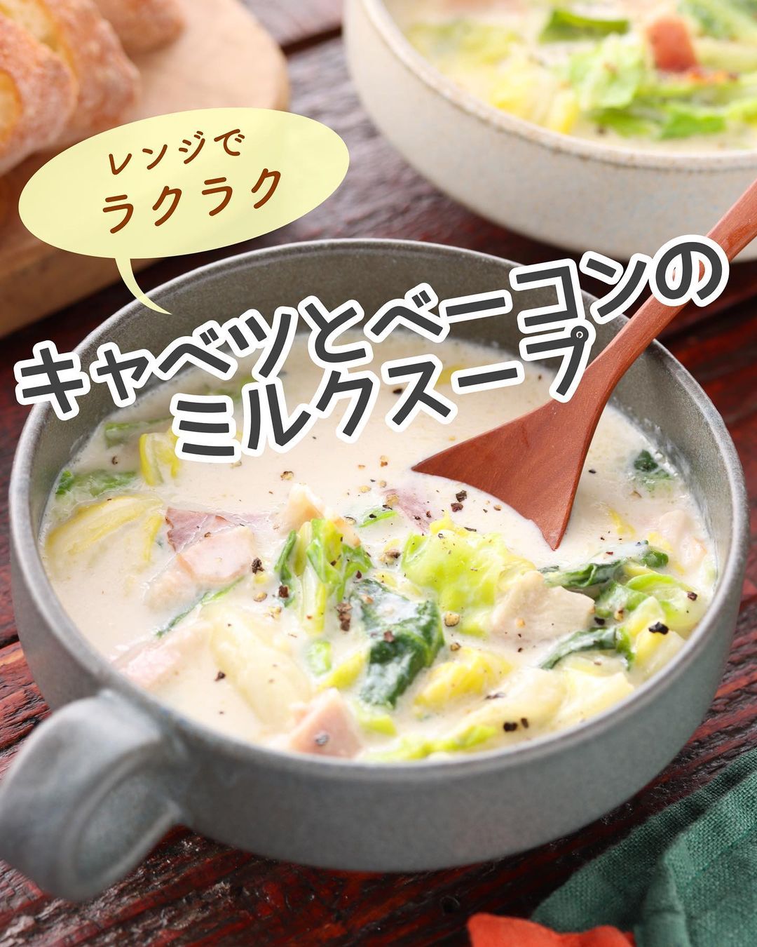 ➊春キャベツは手でちぎる。ベーコンは短冊切りにする。
