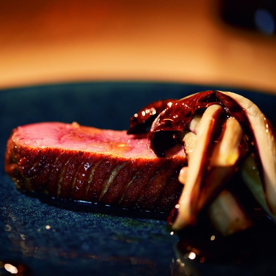 「鴨胸肉のロースト 黒にんにくのソース」は、皮目を焼き付けてからオーブンでゆっくり火を入れてやわらかく焼き上げる。