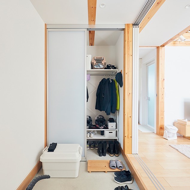 「前の家は1台分がギリギリ停まるくらいだったので、広い駐車場は絶対に欲しかったです。今は駐車場脇にある物置にはバイクを収納していて、夫婦ともにバイクを楽しんでいます。またモデルハウスを見て取り入れたかったのが広めの玄関土間。今は簡単なDIYを行うスペースとして使ったりバイクのメンテナンスを行ったりしています」(ご主人)