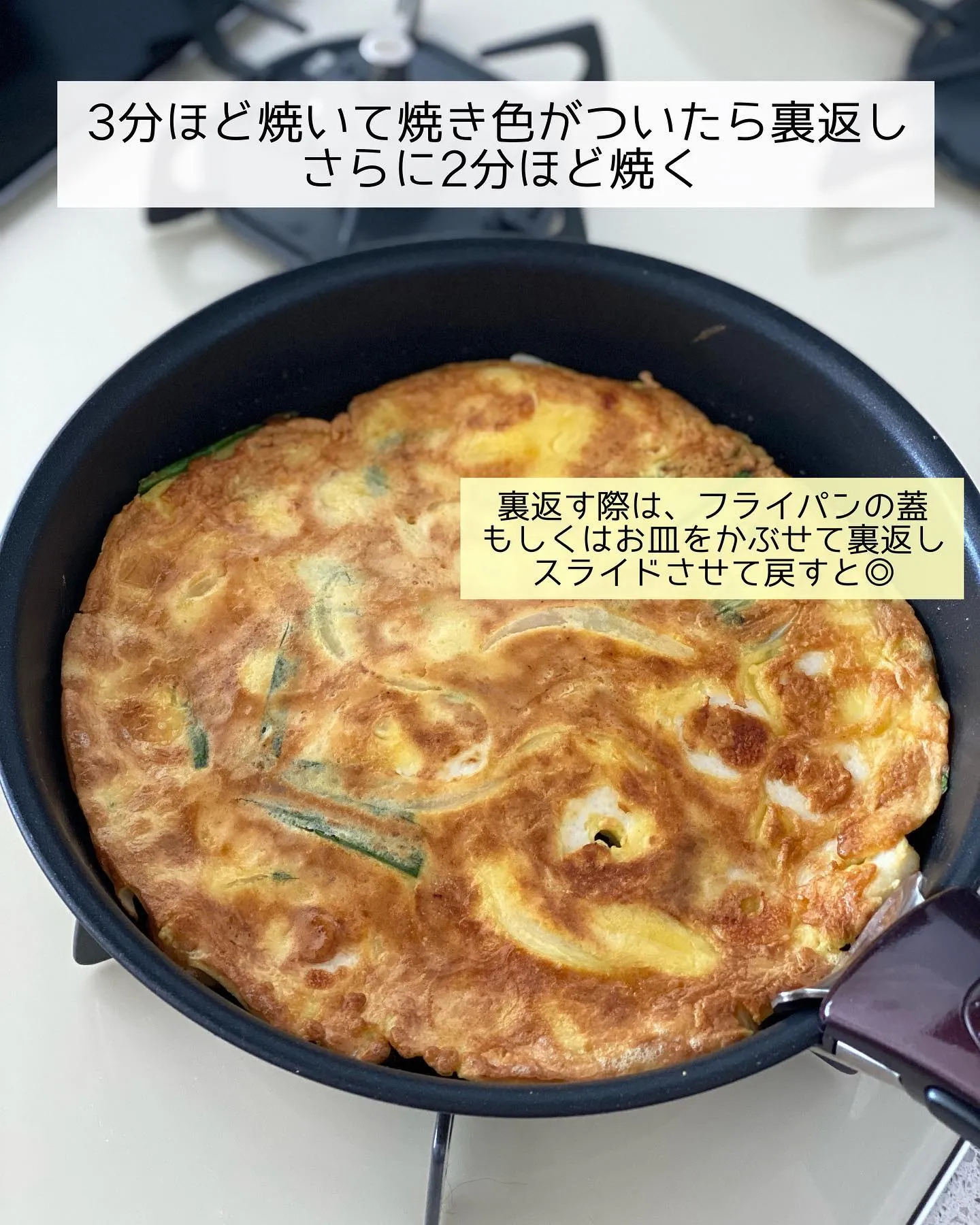 ➌フライパンにごま油を中火で熱し、2を流し入れる。𝟹分ほど焼き、焼き色がついたら裏返し、さらに𝟸分ほど焼く。