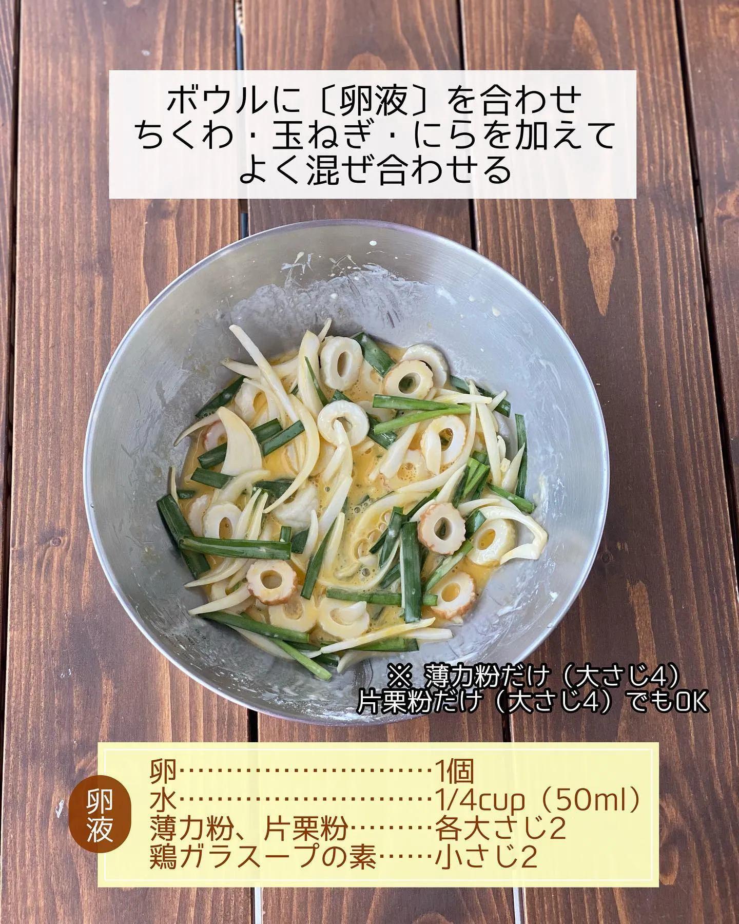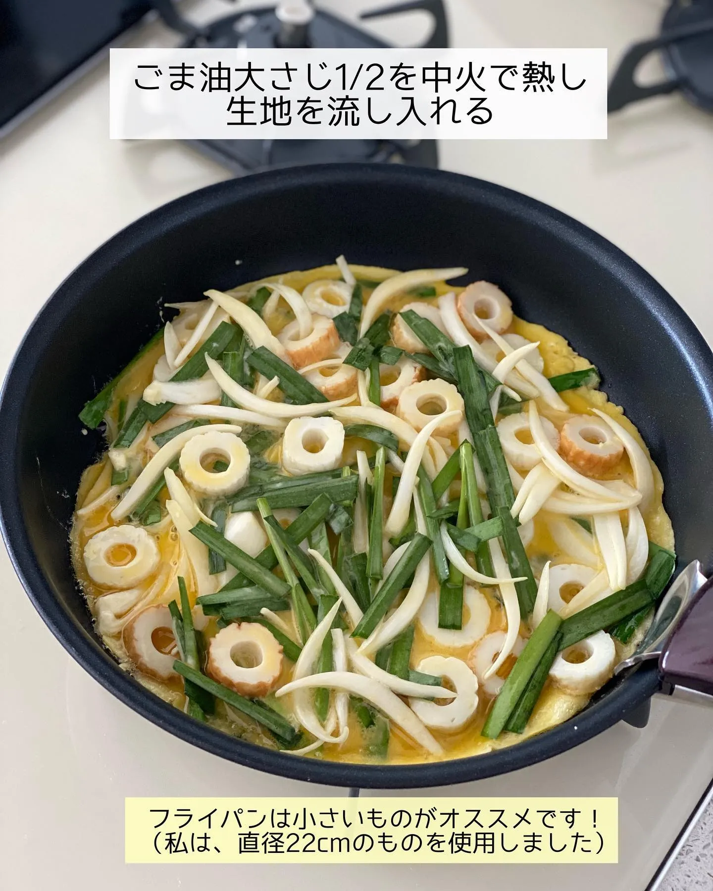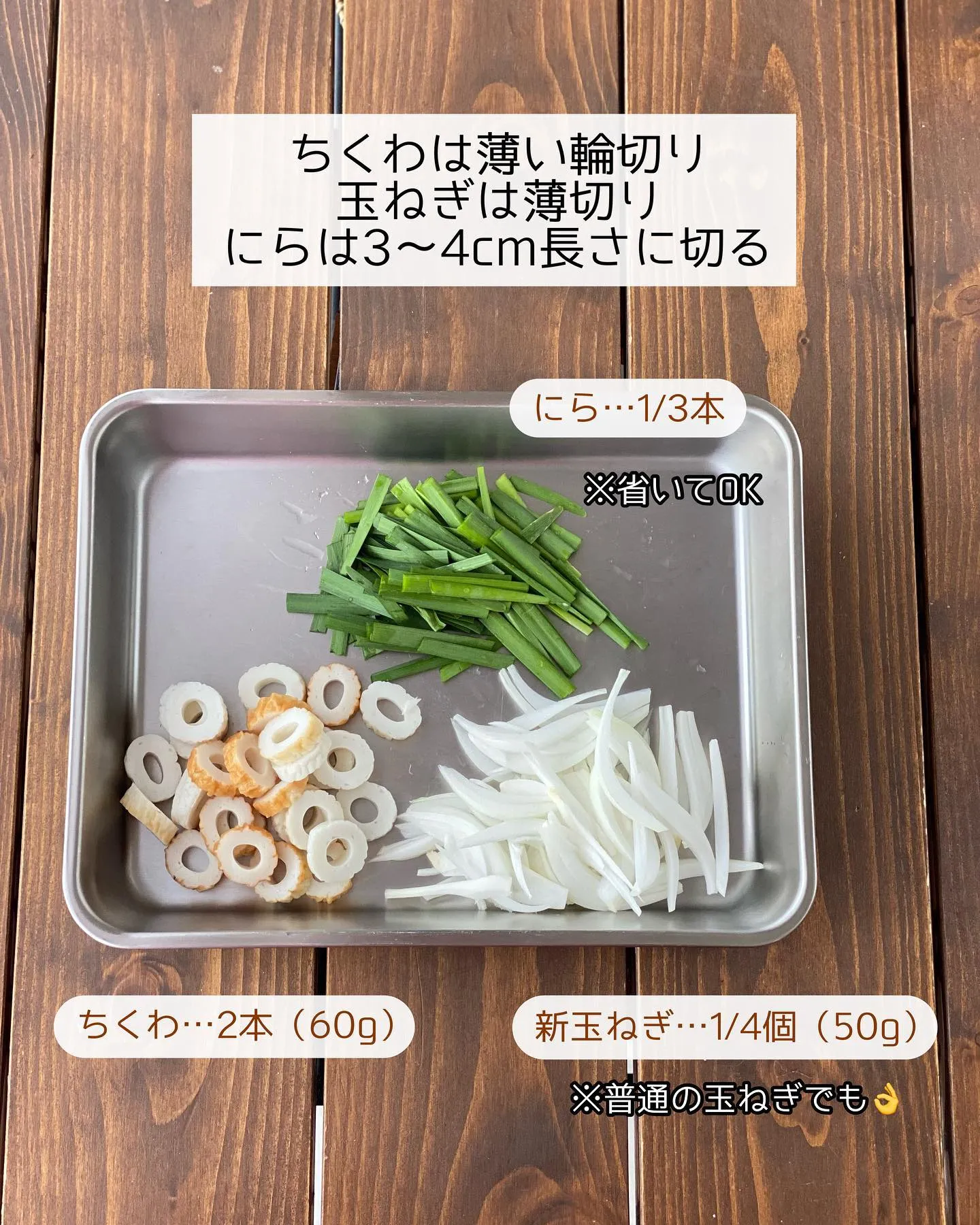 ➊ちくわは薄い輪切り、玉ねぎは薄切り、にらは𝟹〜𝟺𝚌𝚖長さに切る。
