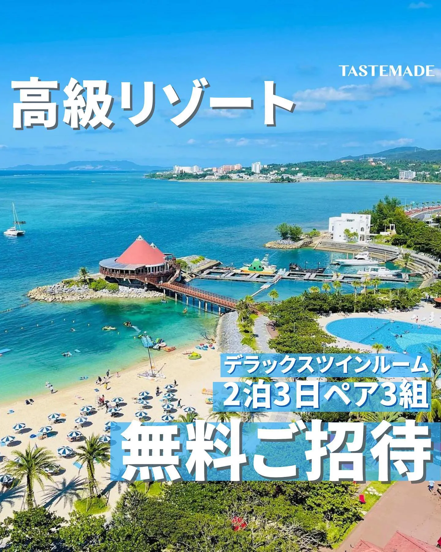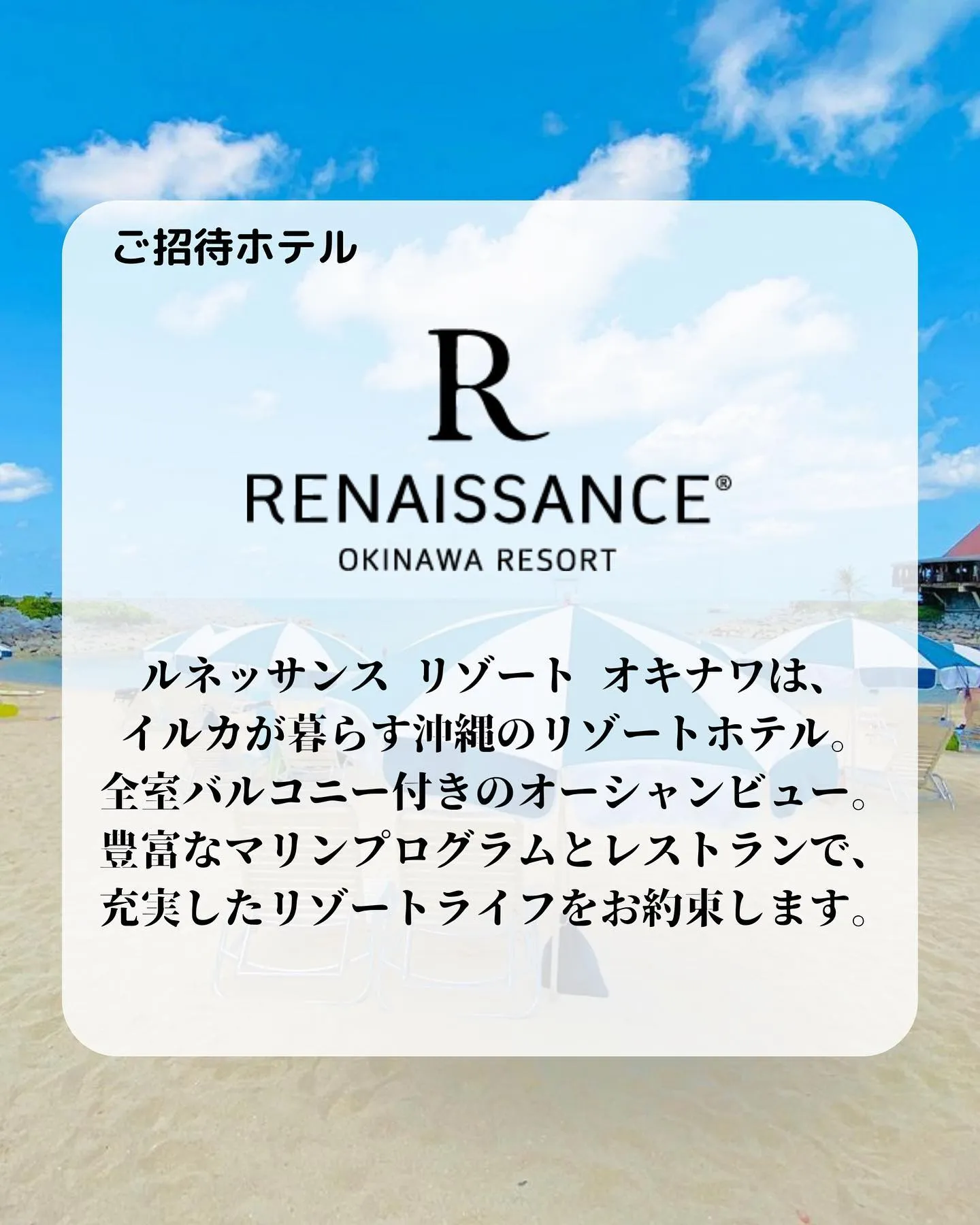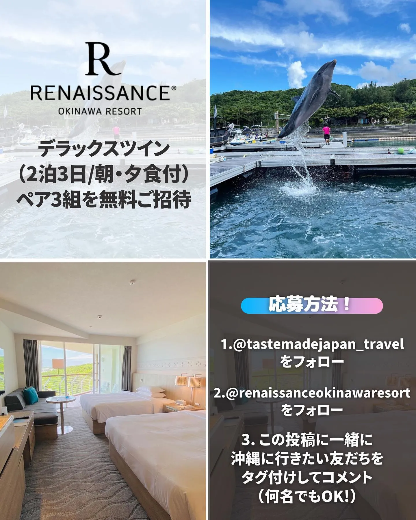 @tastemadejapan_travel と @renaissanceokinawaresort をフォローで沖縄の綺麗な海と空を一望できるデラックスツイン2泊3日のスペシャルなご滞在(朝夕食付き)をペア3組さまにプレゼント🏝🎁