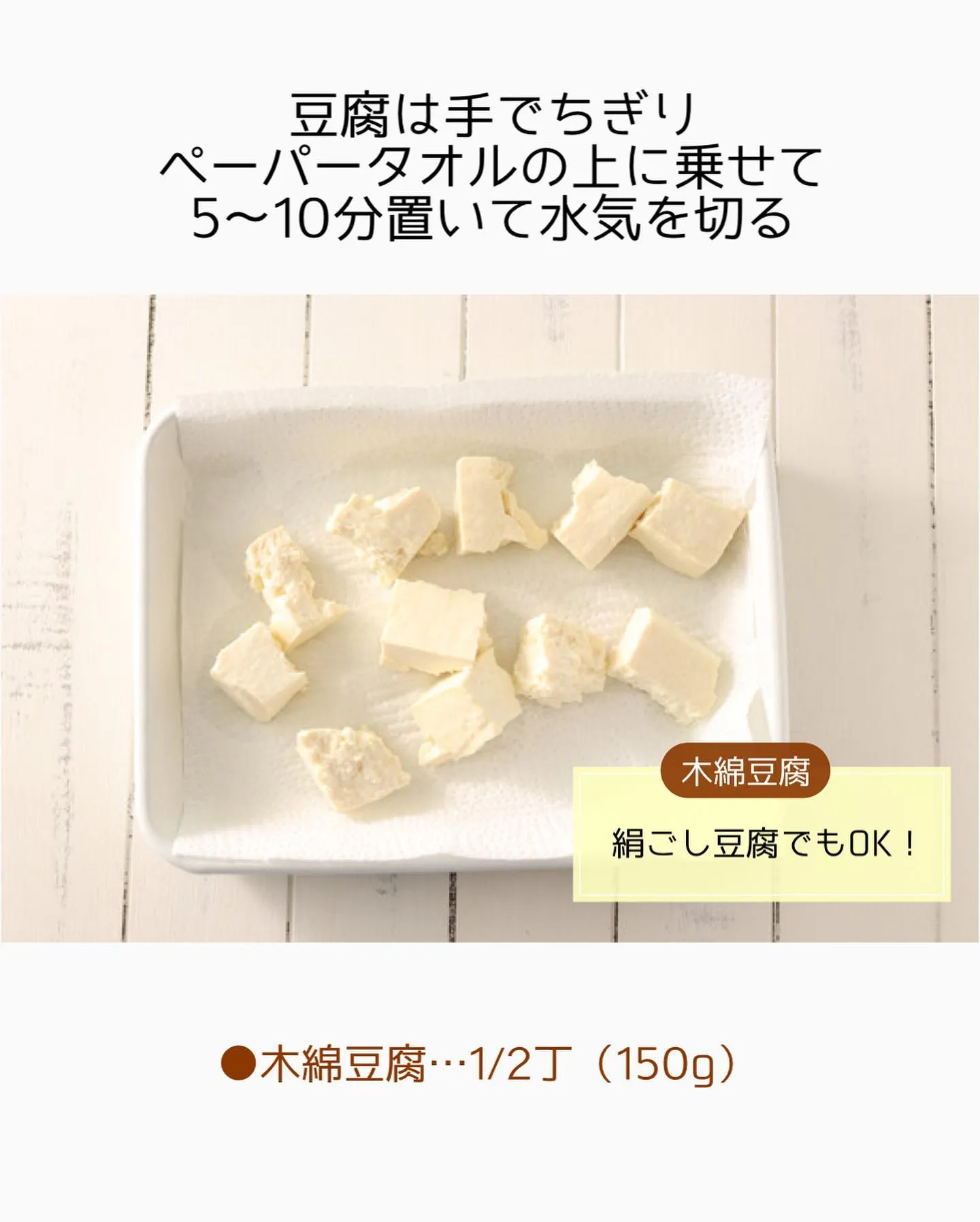 ➊豆腐は手でちぎり、ペーパータオルの上に乗せて𝟻〜𝟷𝟶分置いて水気を切る。