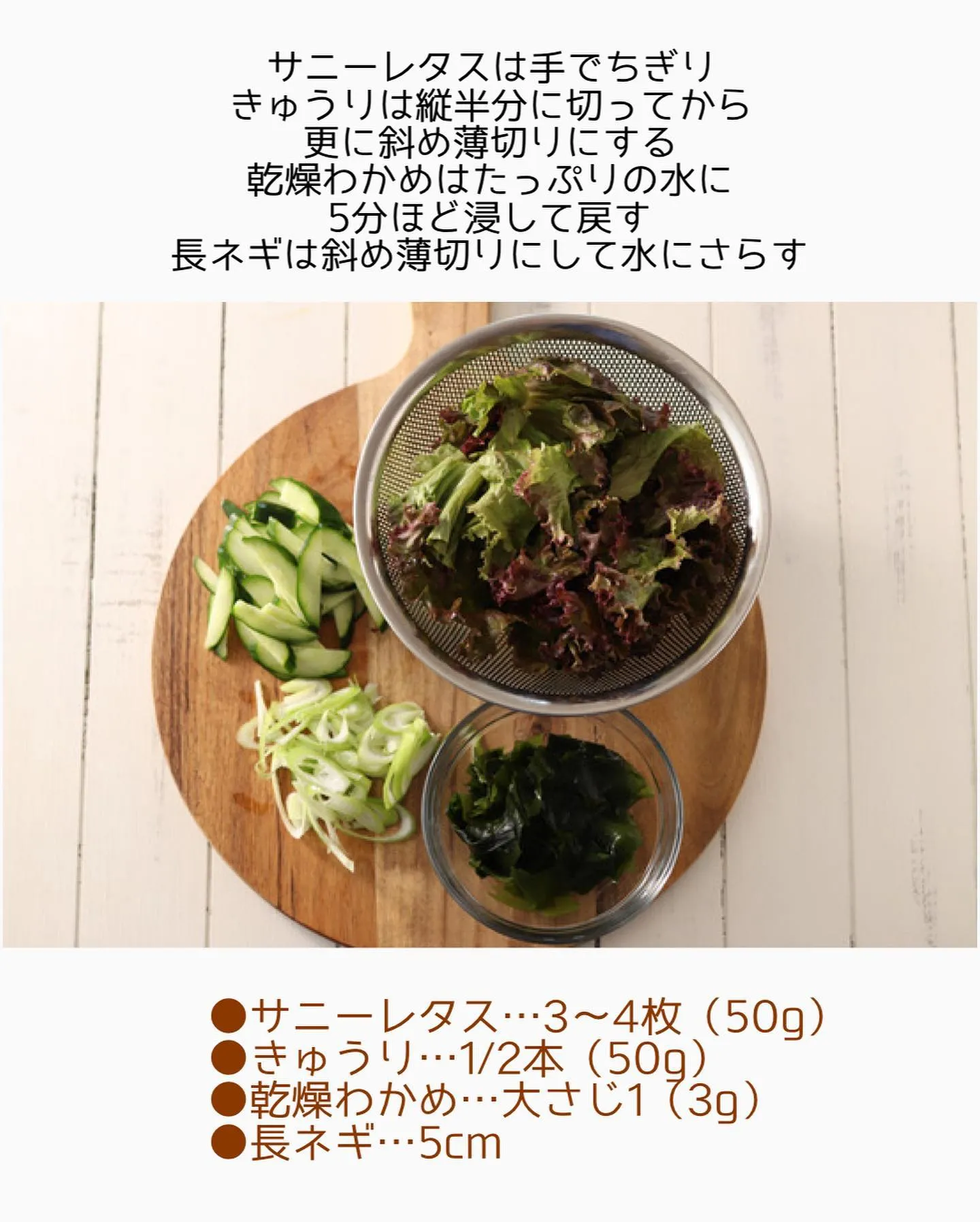 ➋サニーレタスは手でちぎり、きゅうりは縦半分に切ってから更に斜め薄切りにする。乾燥わかめはたっぷりの水に𝟻分ほど浸して戻す。長ネギは斜め薄切りにして水にさらす。