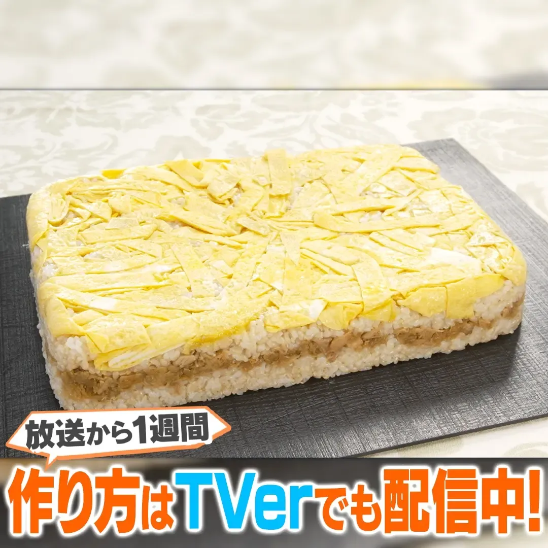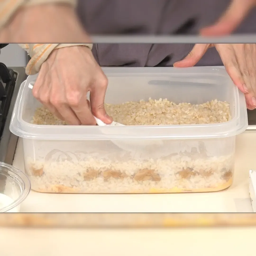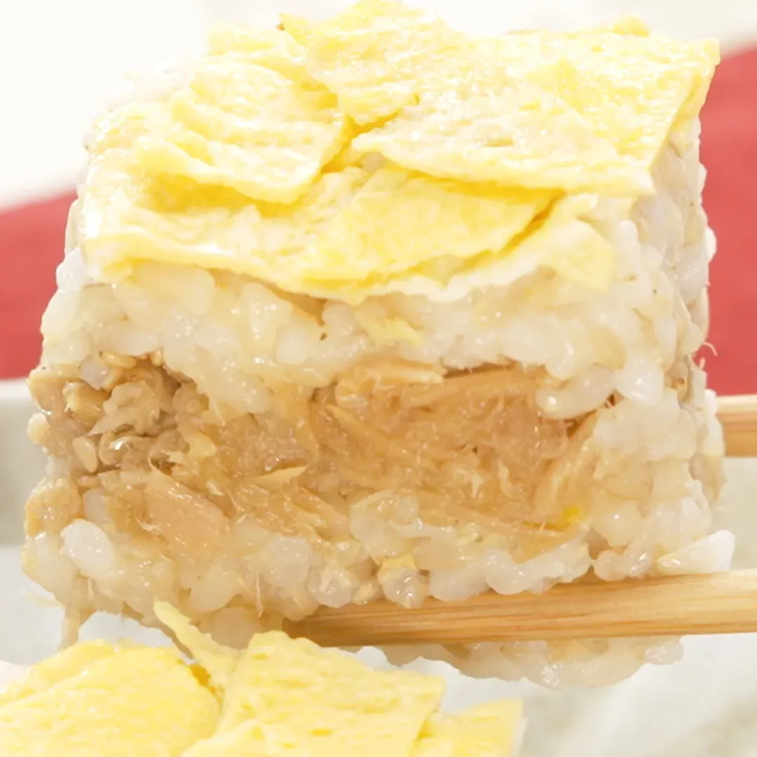 ⑨大きめの保存容器に玉子→酢飯 2 合分→白ごま大さじ2→ツナそぼろ→白ごま大さじ2→酢飯2合分の順で敷き詰め、しゃもじで具材をギュウギュウ押す