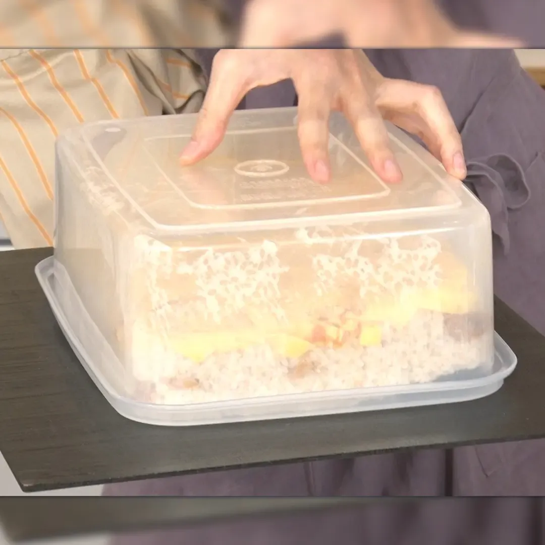⑩⑨の保存容器に大きなお盆を裏向きにのせ、お盆ごとひっくり返したら完成!