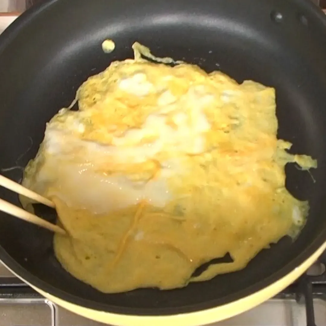 ⑦オリーブオイル適量を熱し、溶いた生卵を薄く広げながら4枚焼く