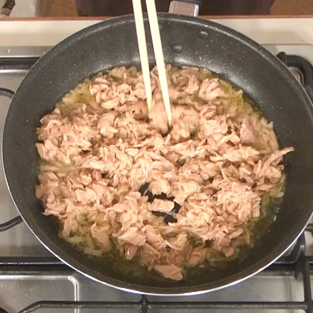 ⑥ツナがそぼろ状になったら、てんさい糖としょう油各大さじ2を加える