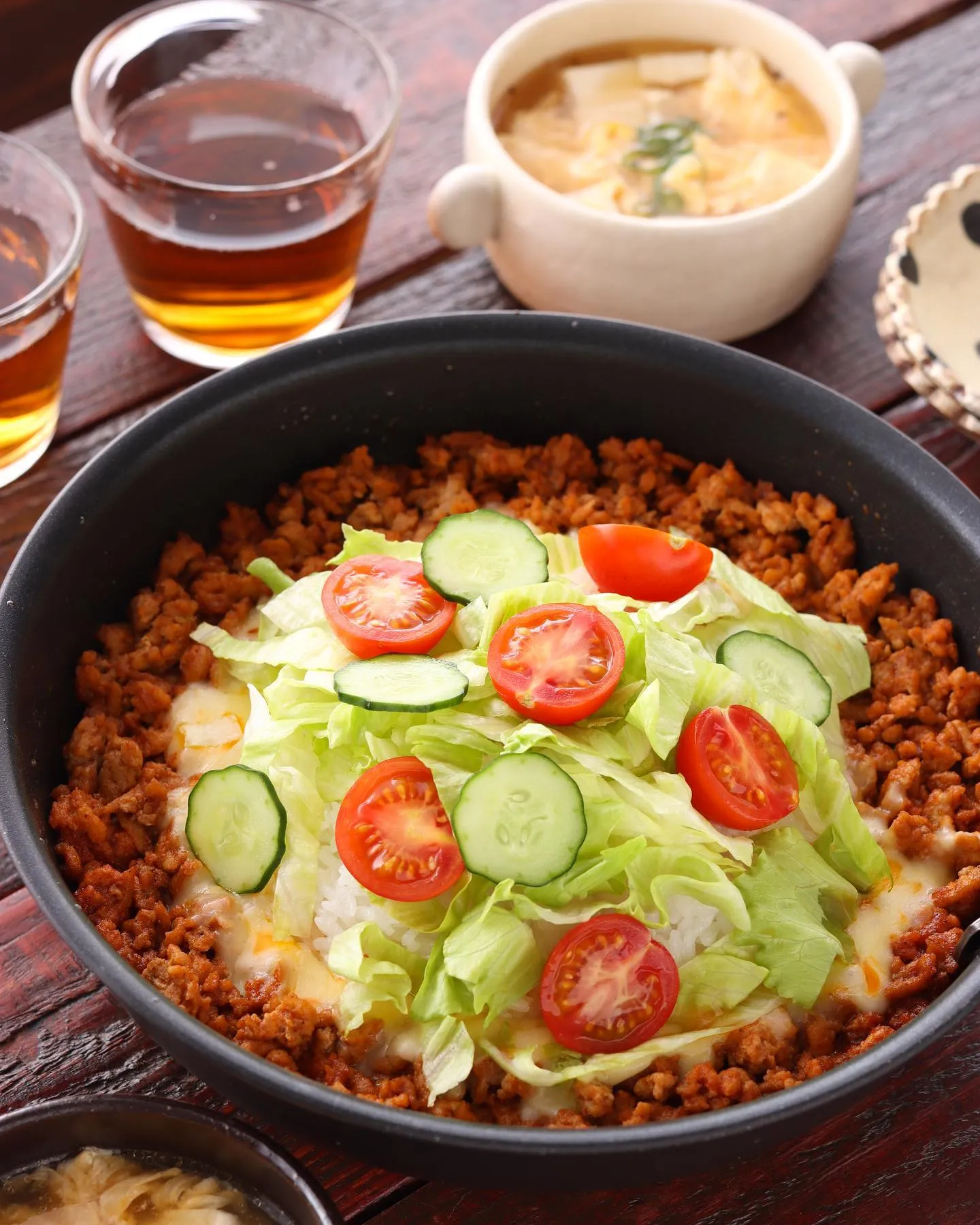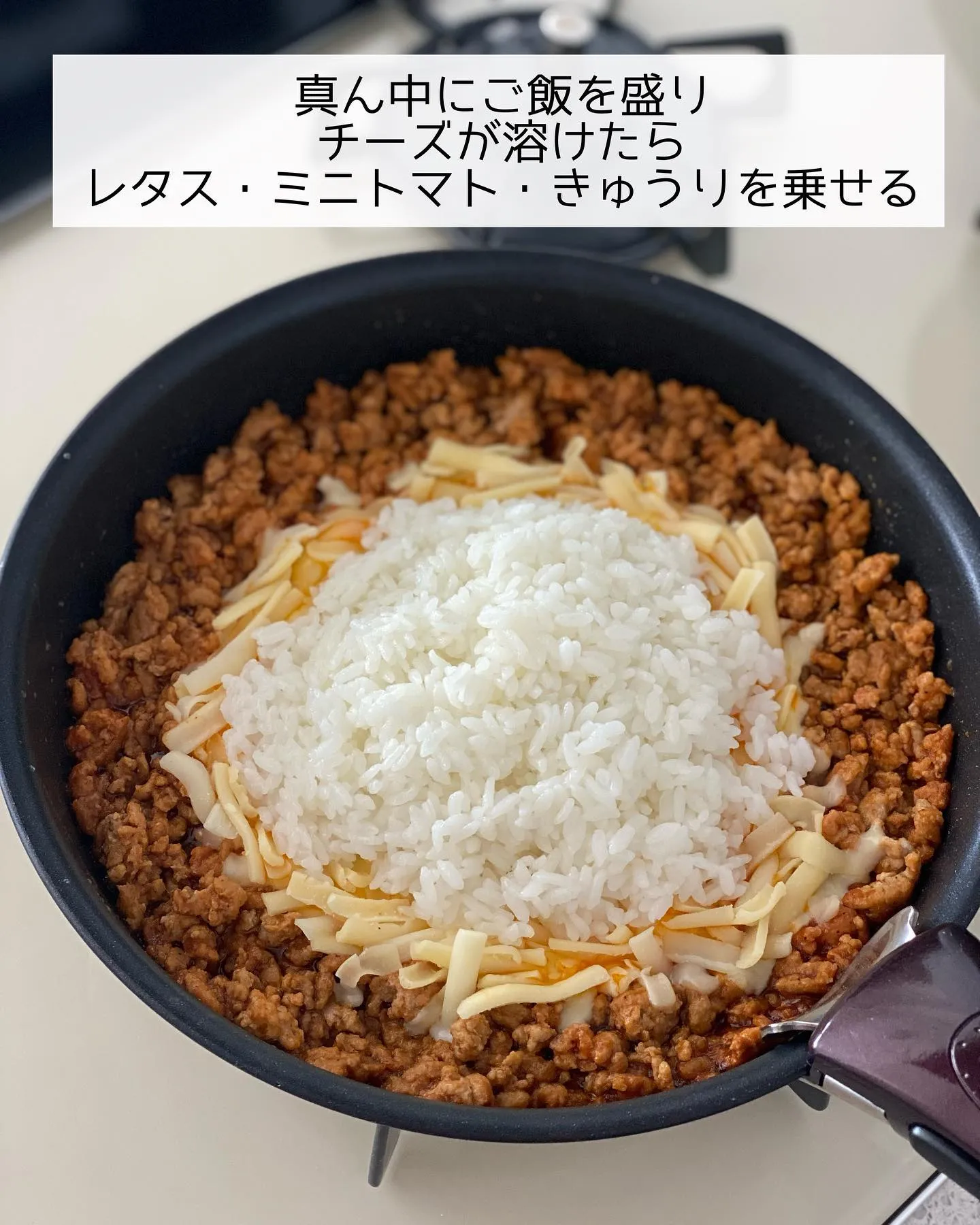 ➋真ん中にご飯を盛り、チーズが溶けたら、レタス・ミニトマト・きゅうりを乗せる。