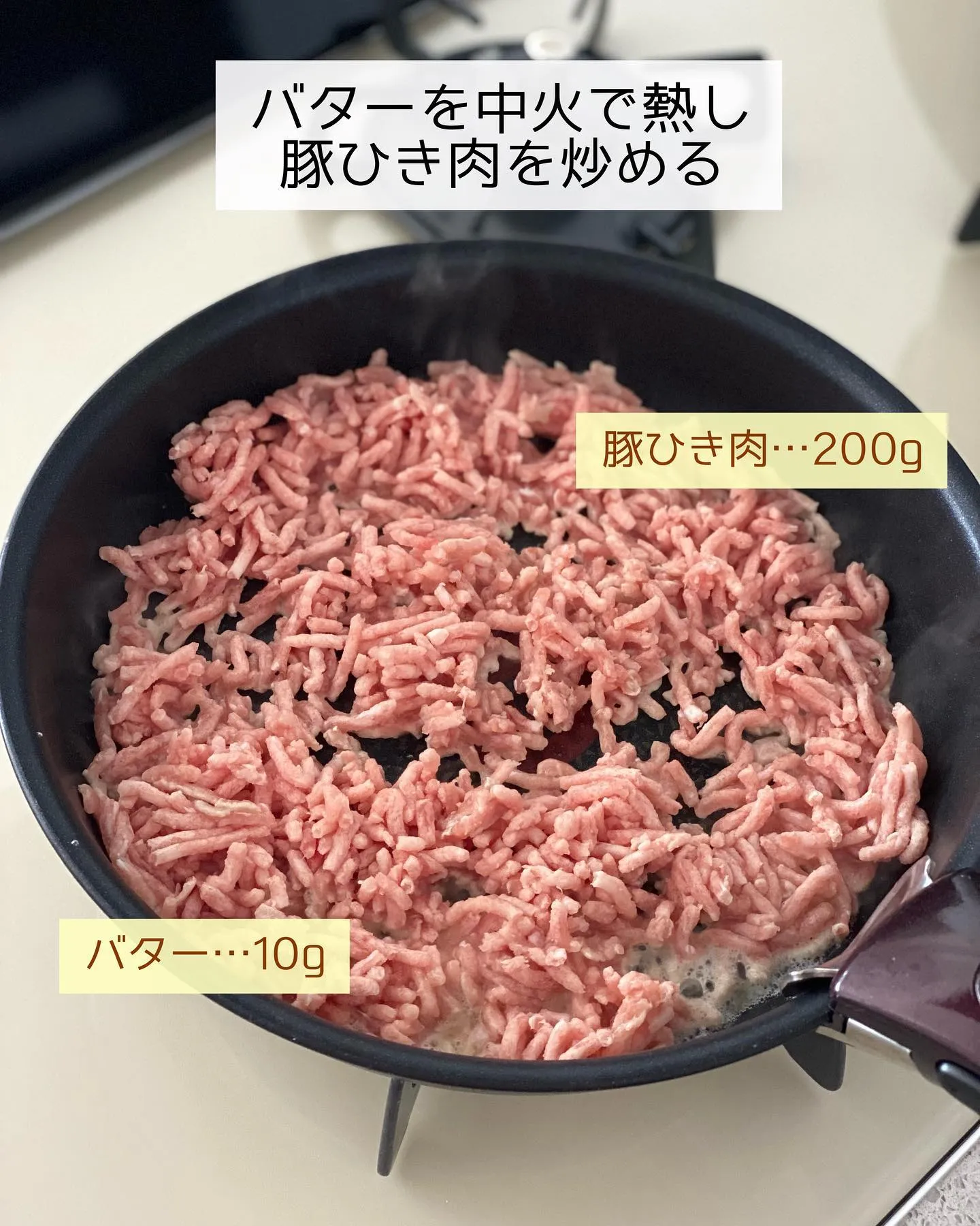 ➊フライパンにバターを中火で熱し、豚ひき肉を炒める。ひき肉の色が変わったら〔⚪︎〕を加えて全体に絡め、フライパンの端に円形状に寄せ、その内側にピザ用チーズ散らす。
