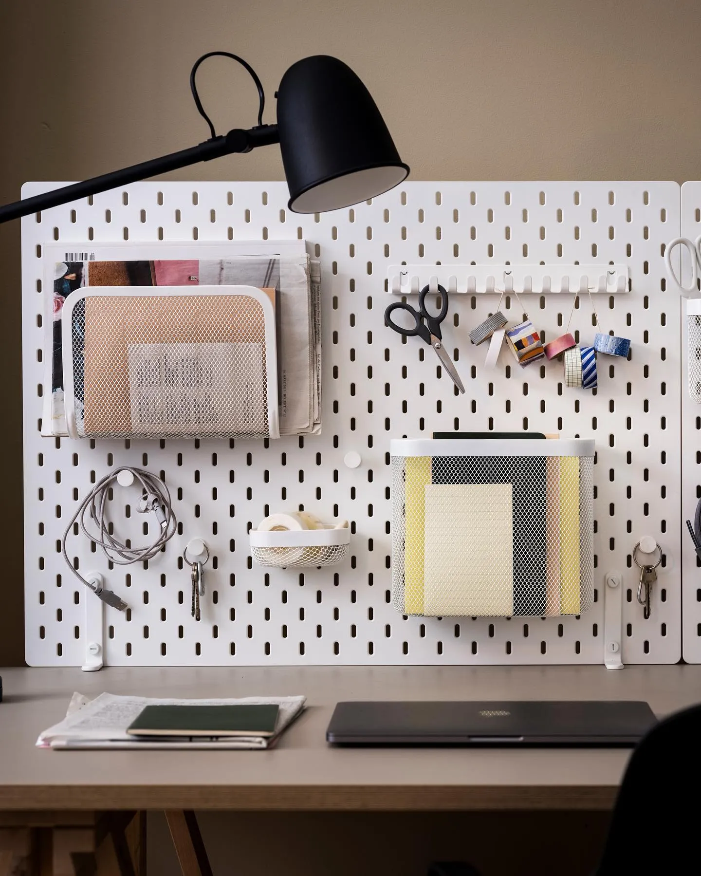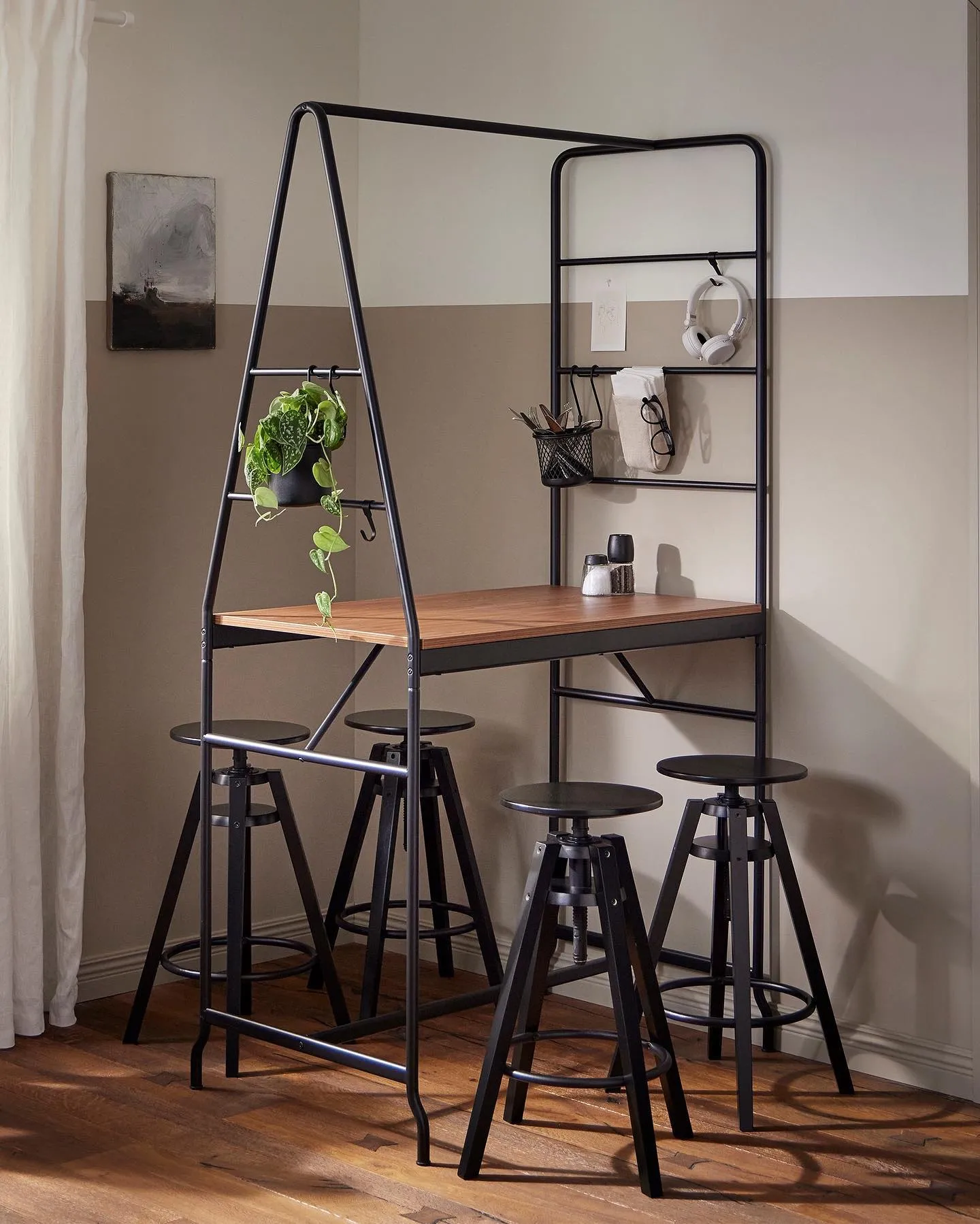 HÅVERUD/ホーヴェルードテーブル はしご収納付きは、仕事から食事まで多用途に使えるデザインが特徴。カウンターのように使えて、立ったり座ったり気分に合わせて作業できます。はしご部分にフックや小物入れなどつるして収納スペースをつくれるので、必要なものにいつでも手が届きます。