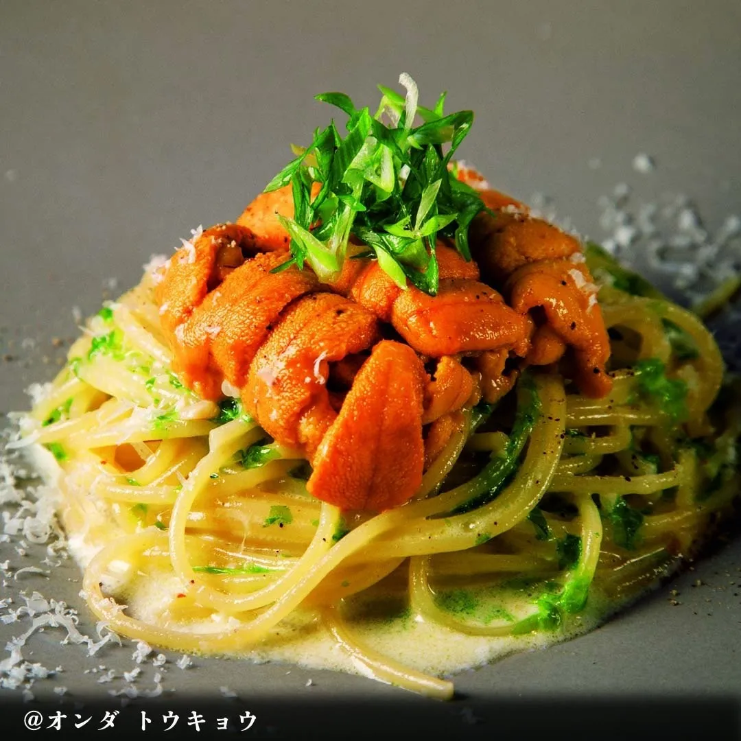 写真③▷写真北海道産ムラサキウニを使ったパスタ。