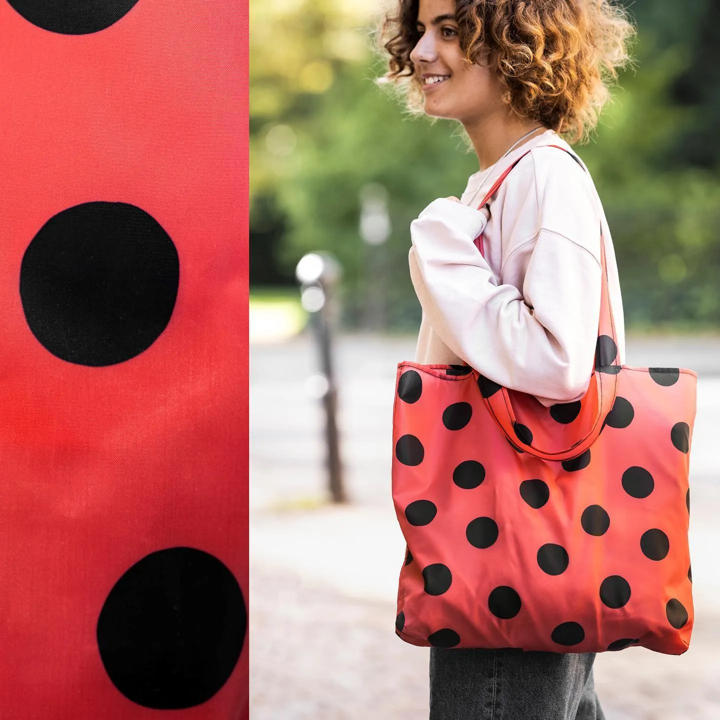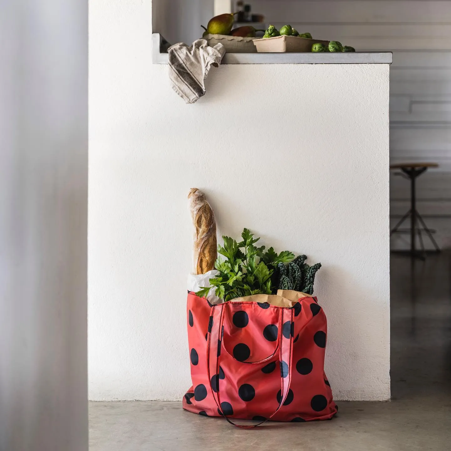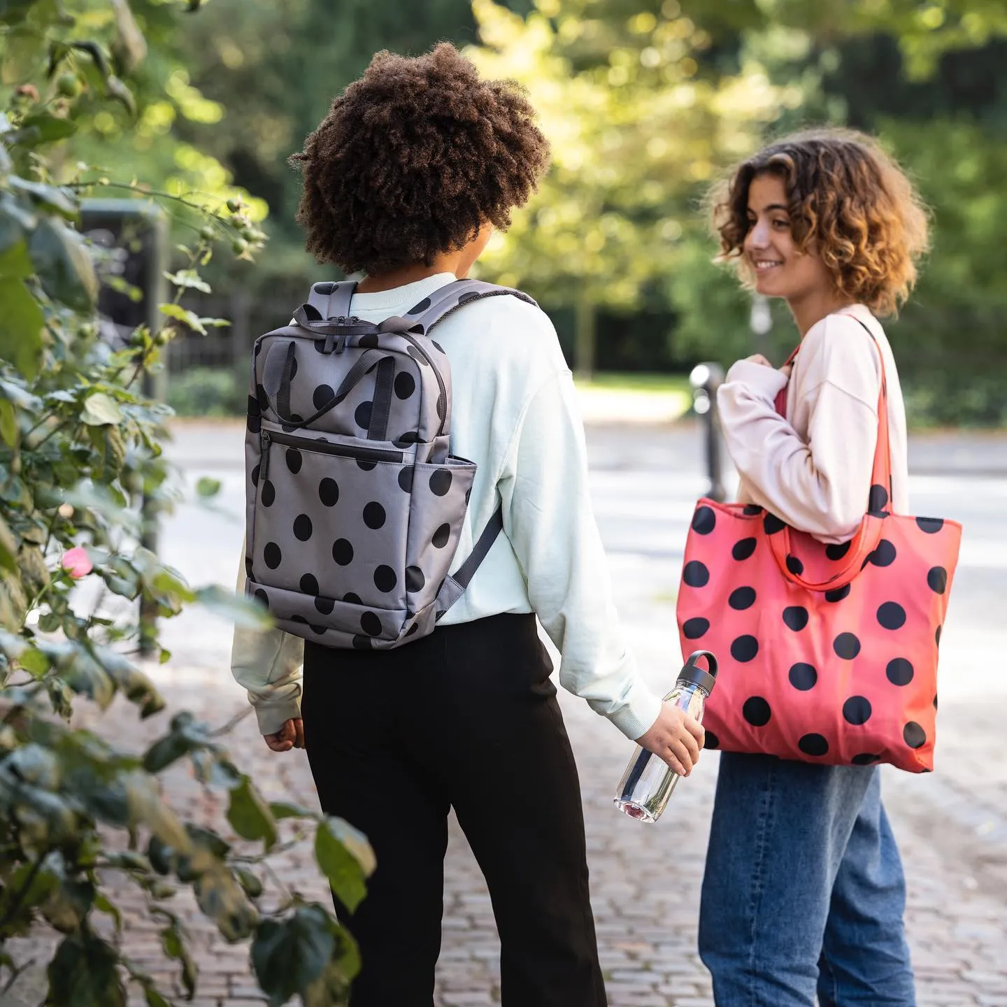 ポップな水玉模様がかわいいSKYNKE/スキンケ エコバッグとSTARTTID/スタルッティド バックパックは、デザイナーが幼少期の思い出からインスピレーションを得たもの。