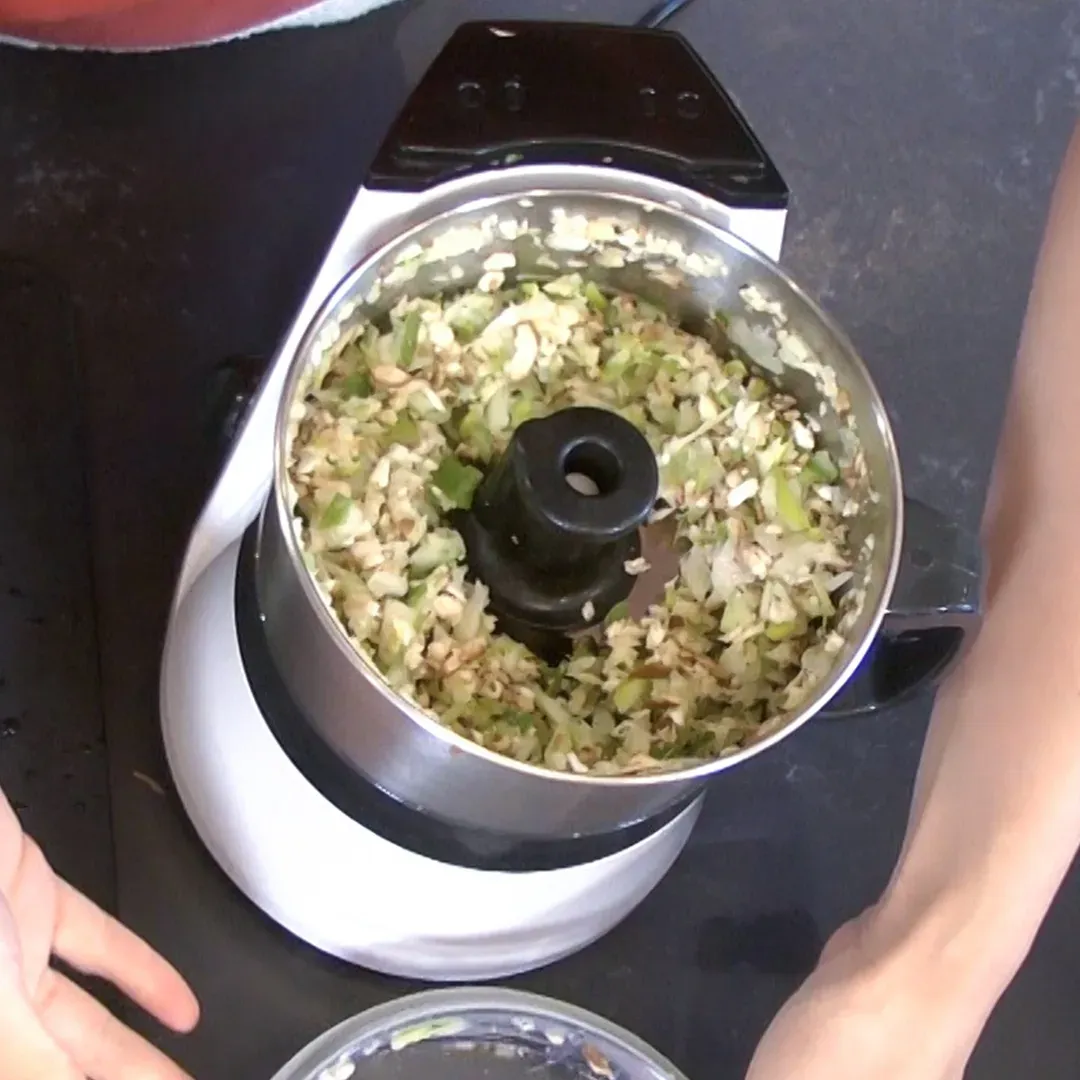 ③ニンニク(2片) しいたけ(2個)ネギ(1/2本)をフードプロセッサーで細かくし、米油(大さじ1)をひいたフライパンに入れ炒める