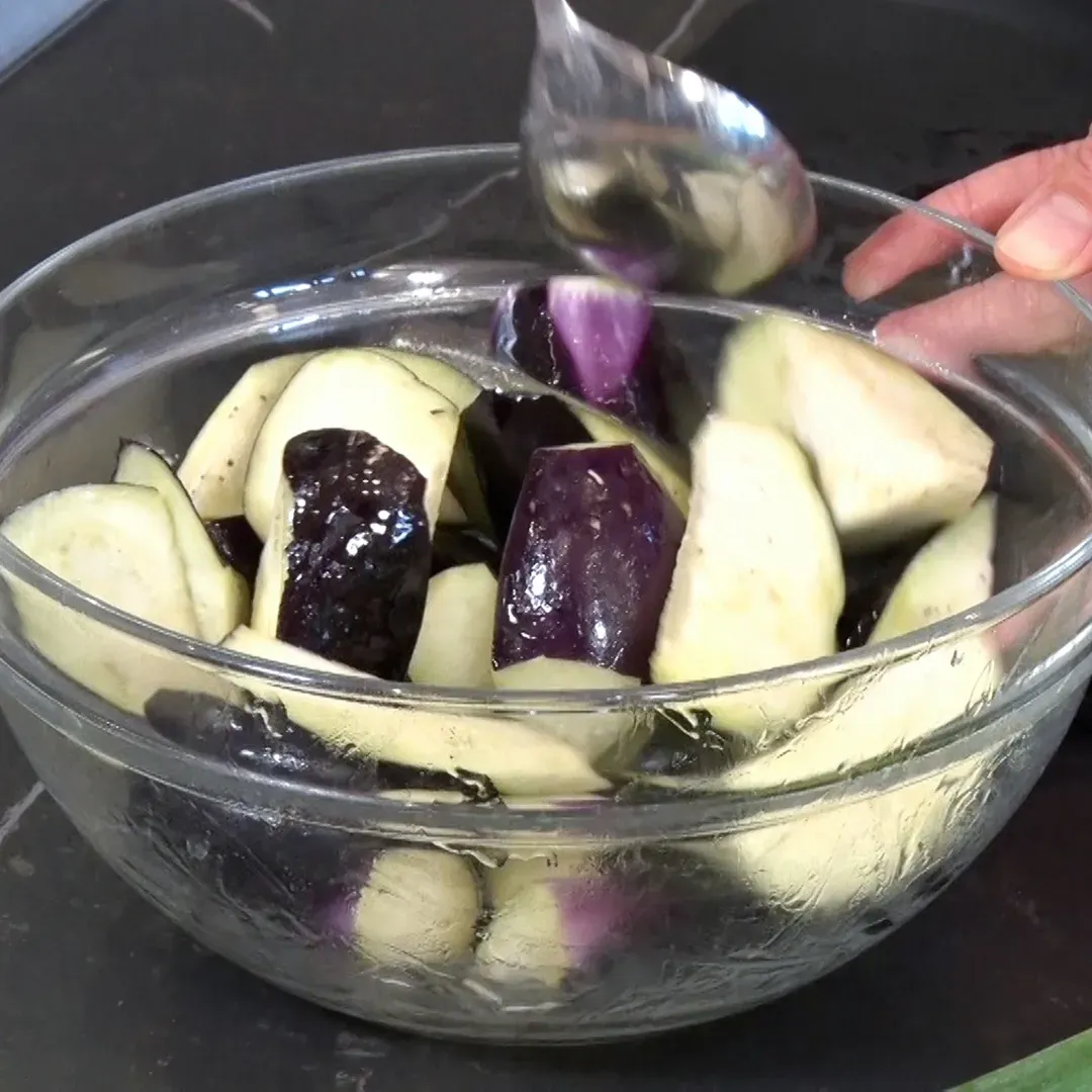 ①ナス(3本)のヘタをとって大きめの乱切りにする
