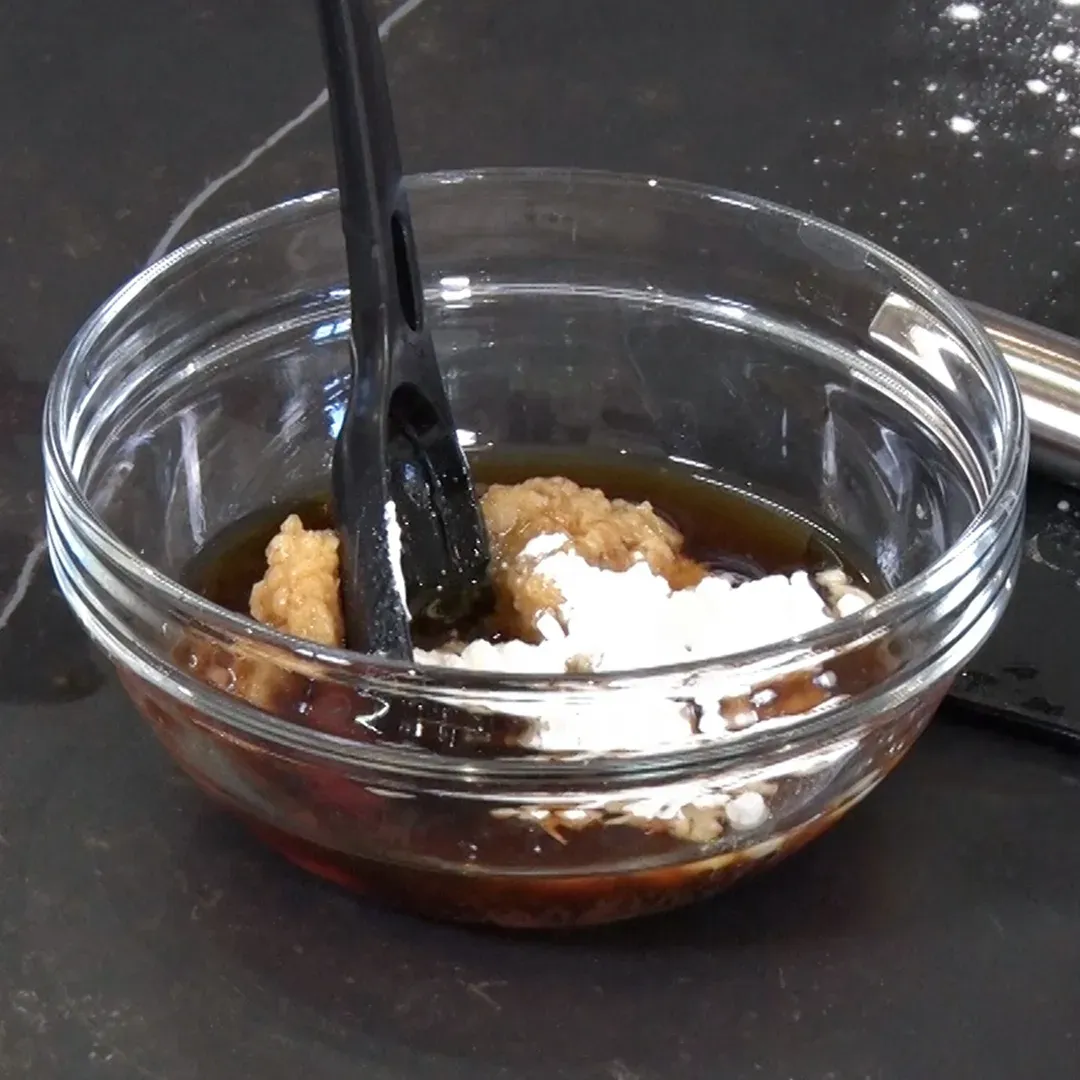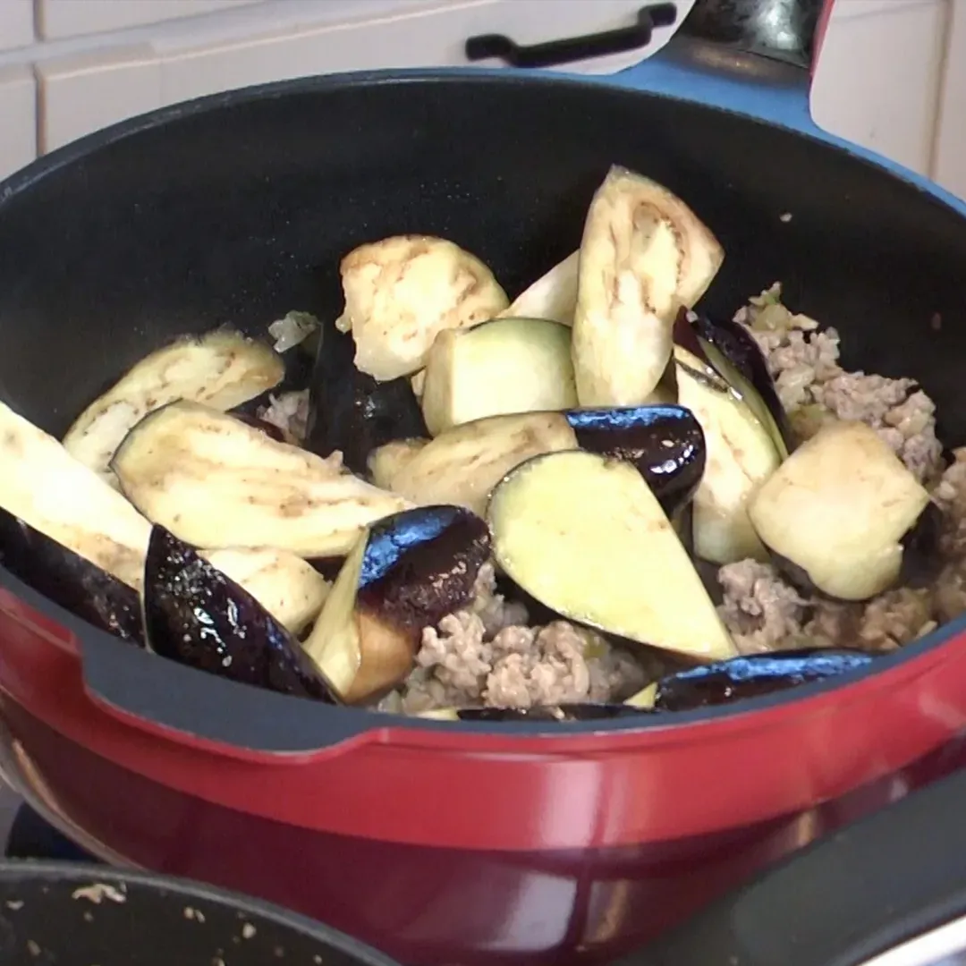 ⑤レンチンしたナスと酒(大さじ2)みりん(大さじ2)しょう油(大さじ1)味噌(大さじ2)片栗粉(小さじ2)を混ぜた調味料、水(1カップ)を加え炒める