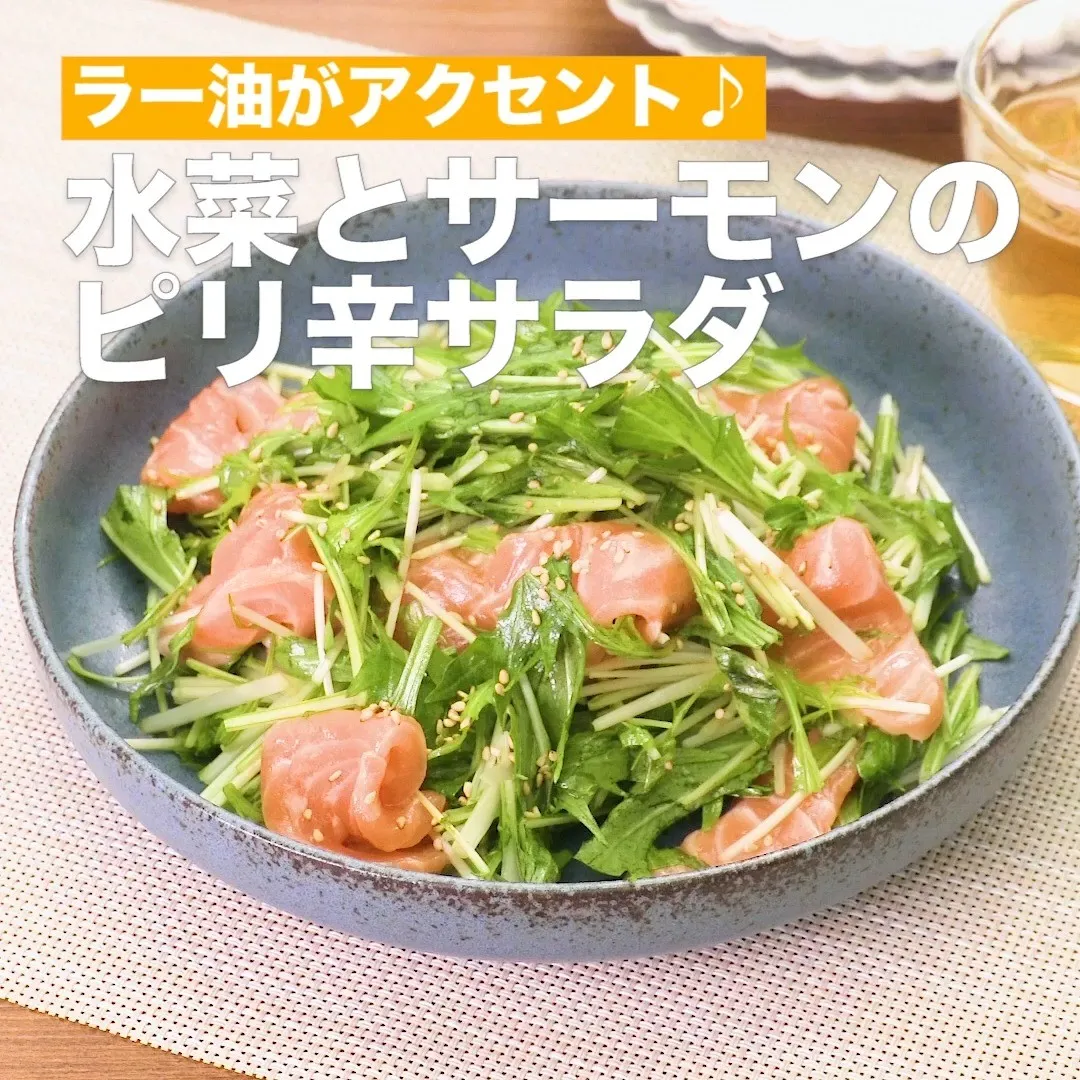 ⑥<ラー油がアクセント♪水菜とサーモンのピリ辛サラダ>