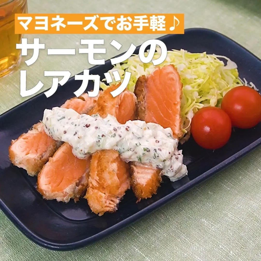 ①<マヨネーズでお手軽♪サーモンのレアカツ>