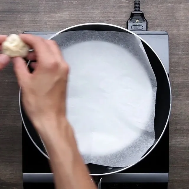 4.フライパンにクッキングシートをしいた小皿を置き、(3)を間隔をあけて並べる。小皿がかぶるくらいの水を入れて蓋をしめ、中火で5分ほど蒸したら、完成!