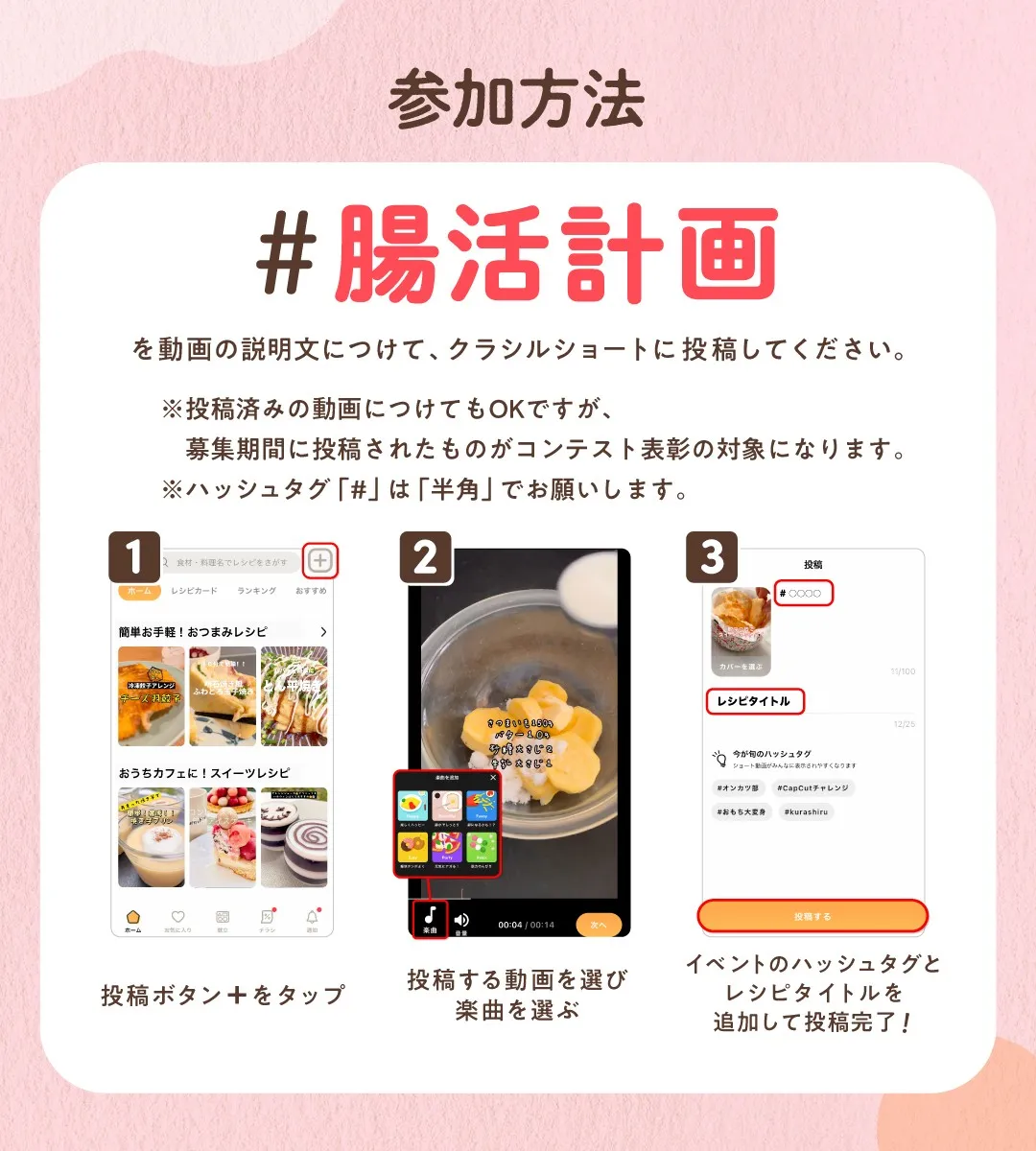 コンテスト期間内に「#腸活計画」を動画の説明文につけて、動画を投稿してください📱👈