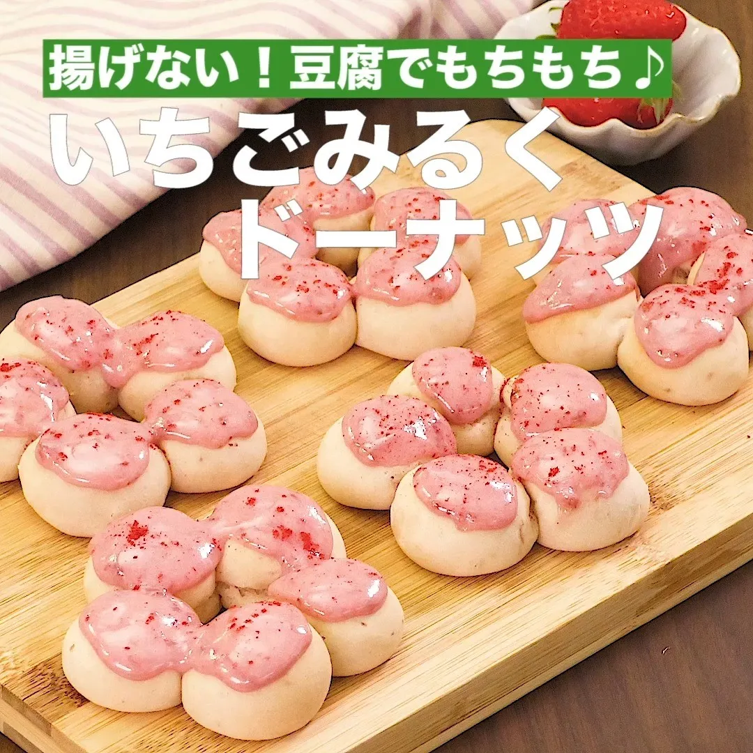 ①<揚げない!豆腐でもちもち♪いちごみるくドーナッツ>