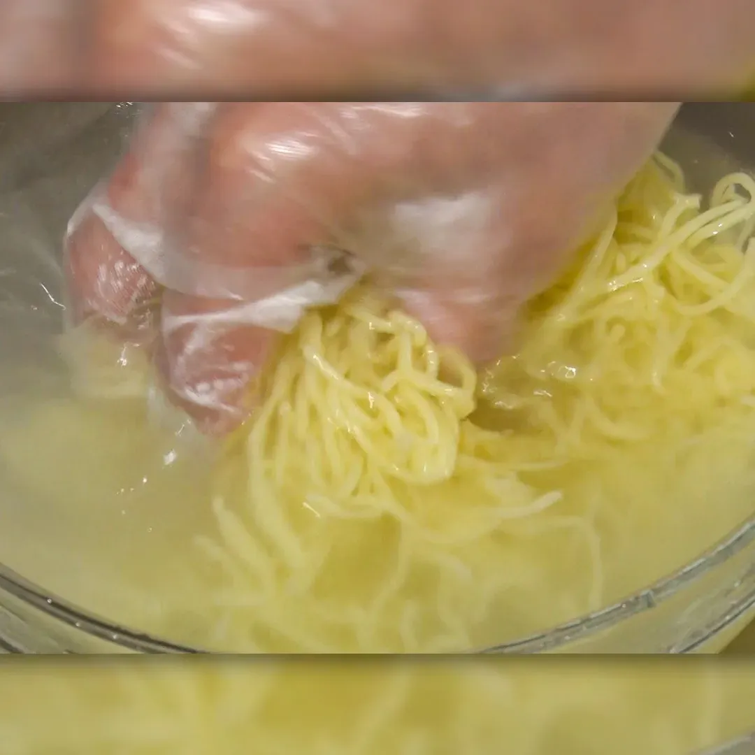 ①水の入ったボウルに焼きそば麺を入れほぐす