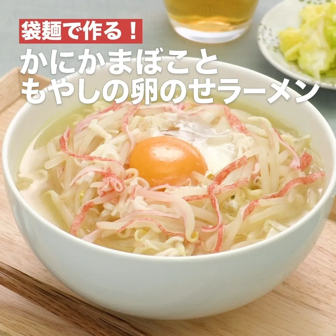 ⑥<袋麺で作る!かにかまぼこともやしの卵のせラーメン>