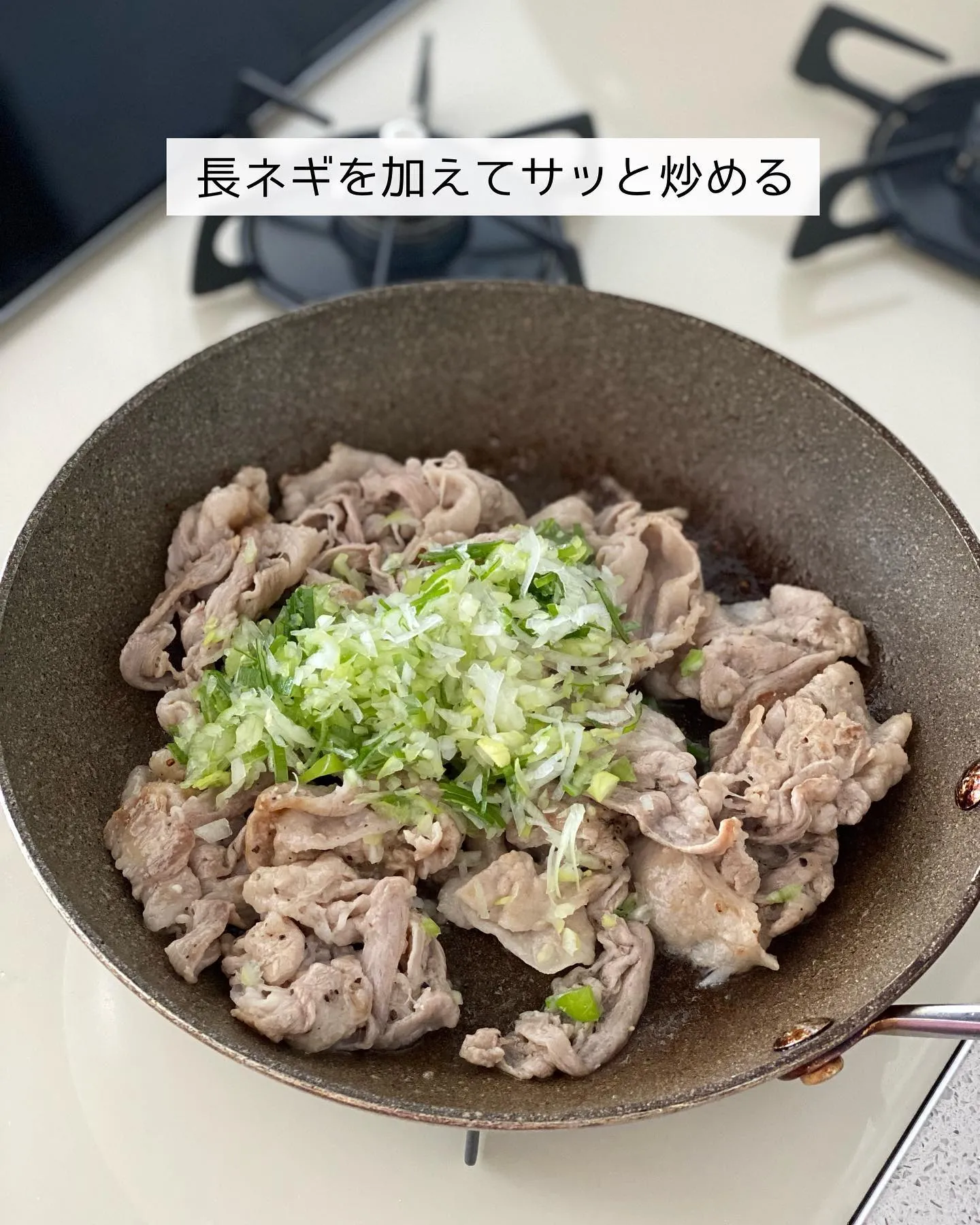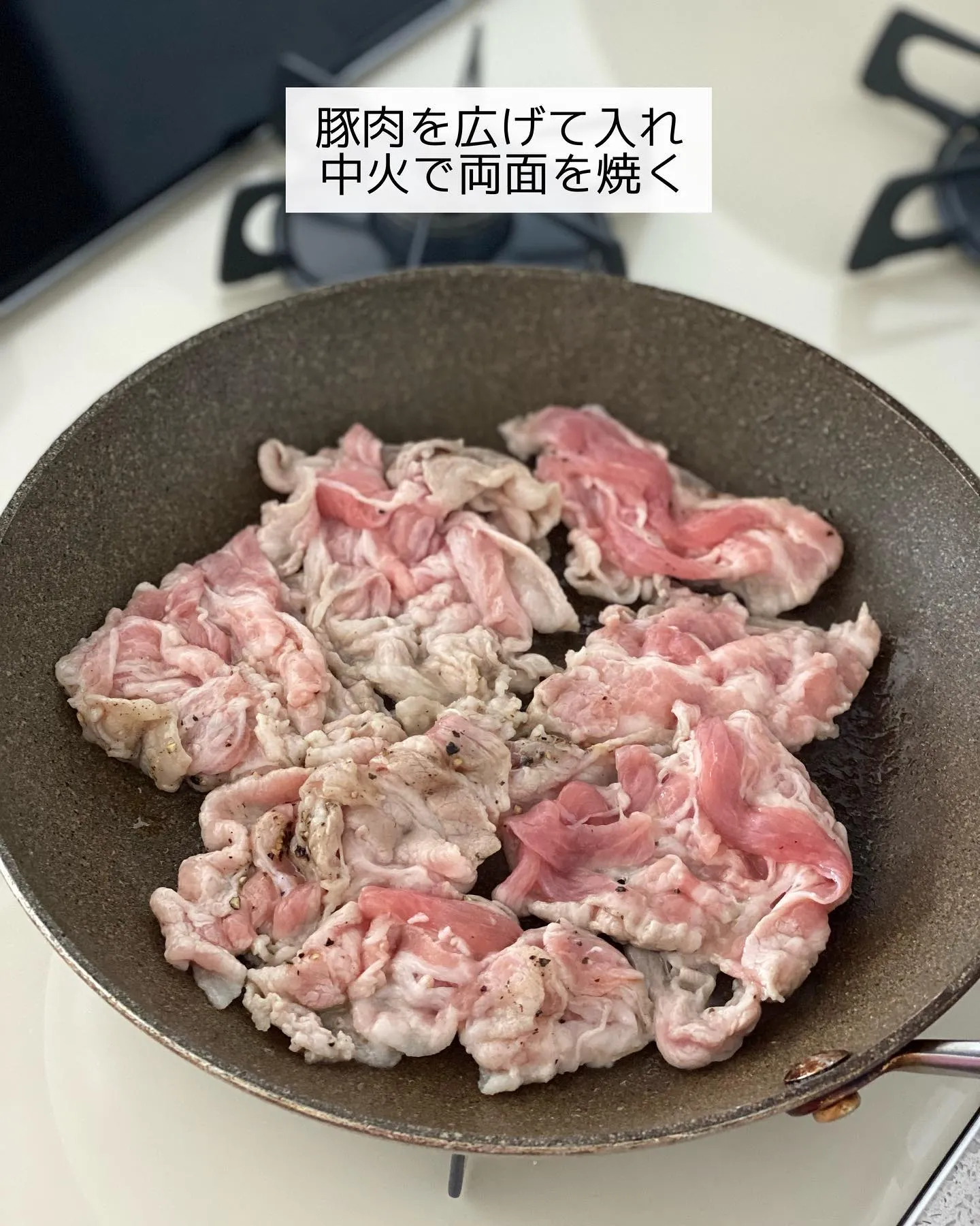 ➋フライパンを中火で熱し、豚肉を広げて入れる。途中上下を返し、全体に火が通るまで焼く。