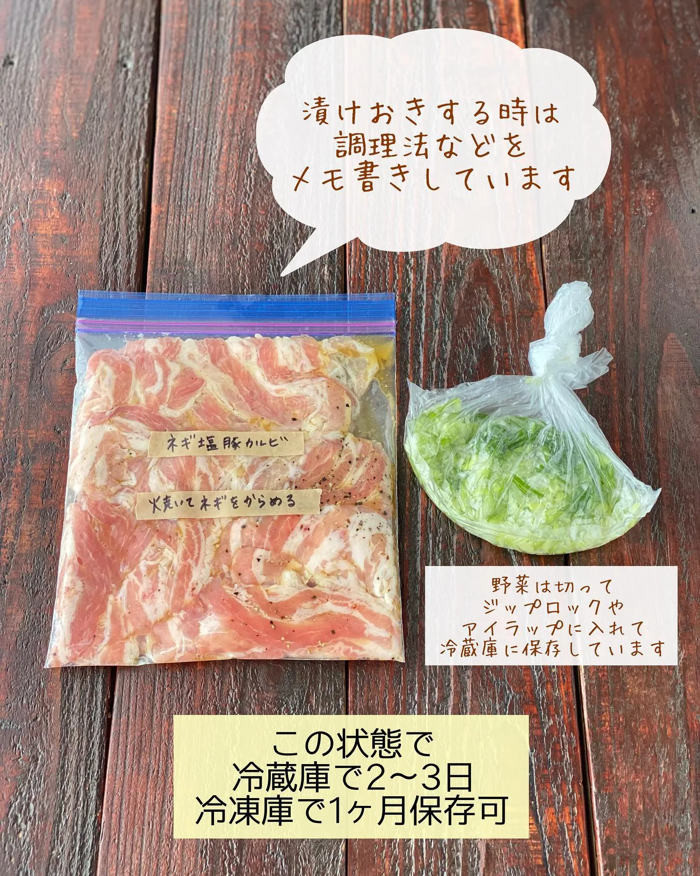 ➊豚肉は〔○〕を揉み込む。長ネギは粗みじん切りにする。