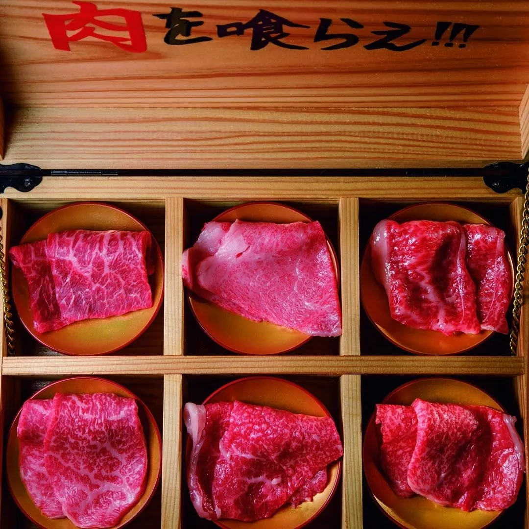 特注した木箱に、厳選した希少部位を入れた“肉のおもちゃ箱”が、最高に映えると大人気だ。