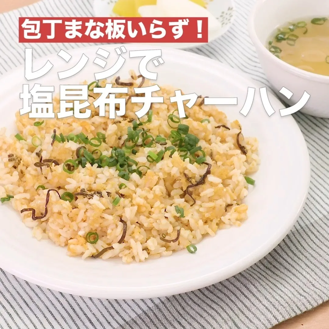 ⑥<包丁まな板いらず!レンジで塩昆布チャーハン>