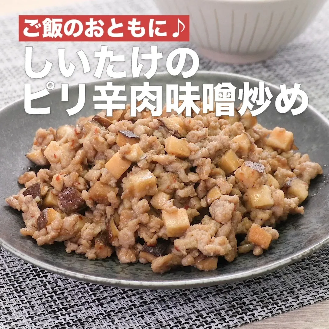 しいたけを大きめに切って食感を楽しめる肉味噌に仕上げました。少しピリ辛にすることでご飯が進む味わいに!