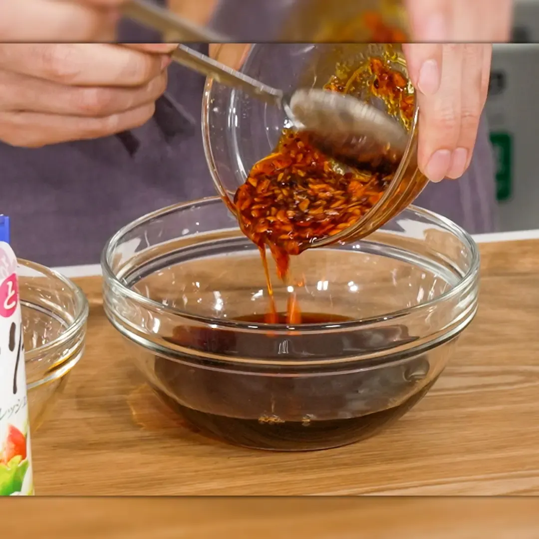 ①ボウルにめんつゆ(3 倍濃縮)(100ml)と食べるラー油(大さじ 3)を入れる