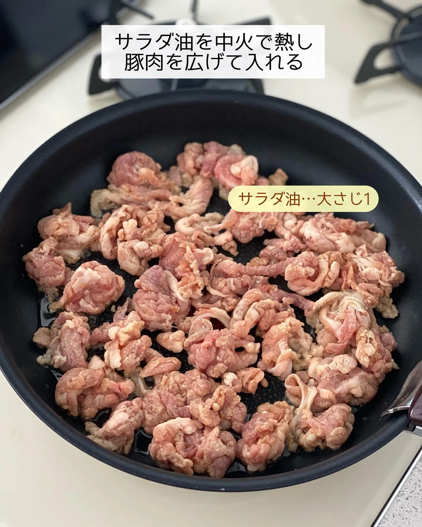 ➌フライパンにサラダ油を中火で熱し、豚肉を広げて入れる。途中上下を返し、全体がカリッとするまで𝟺〜𝟻分焼く。