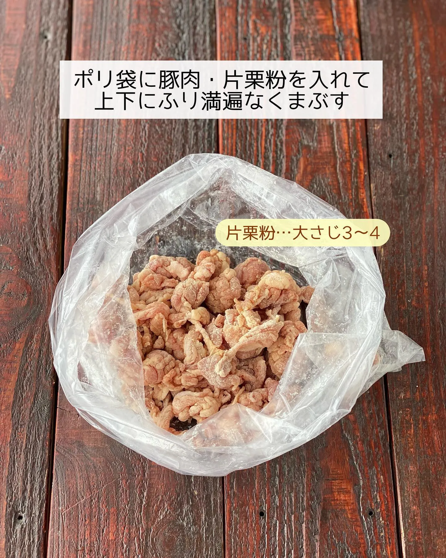 ➋ポリ袋に豚肉・片栗粉を入れて上下にふり、満遍なくまぶす。
