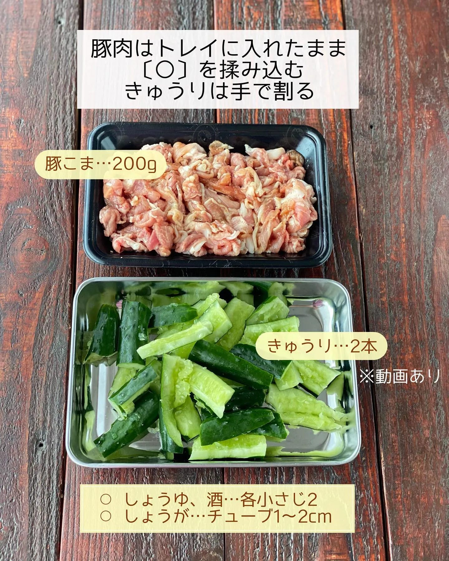 ➊豚肉はトレイに入れたまま〔○〕を揉み込む。きゅうりは手で割る(※)。