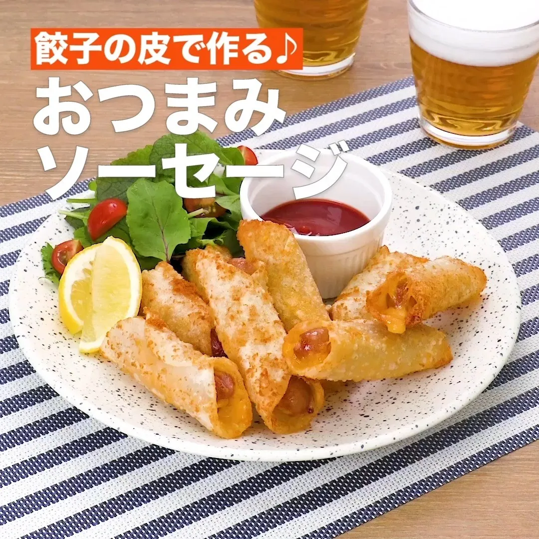 餃子の皮で包むことでまわりがパリパリになり、おやつやおつまみにぴったりです♪ソーセージは切り込みを入れてから巻くことで破裂を防ぎます。餃子の皮が余った際はぜひご活用ください。