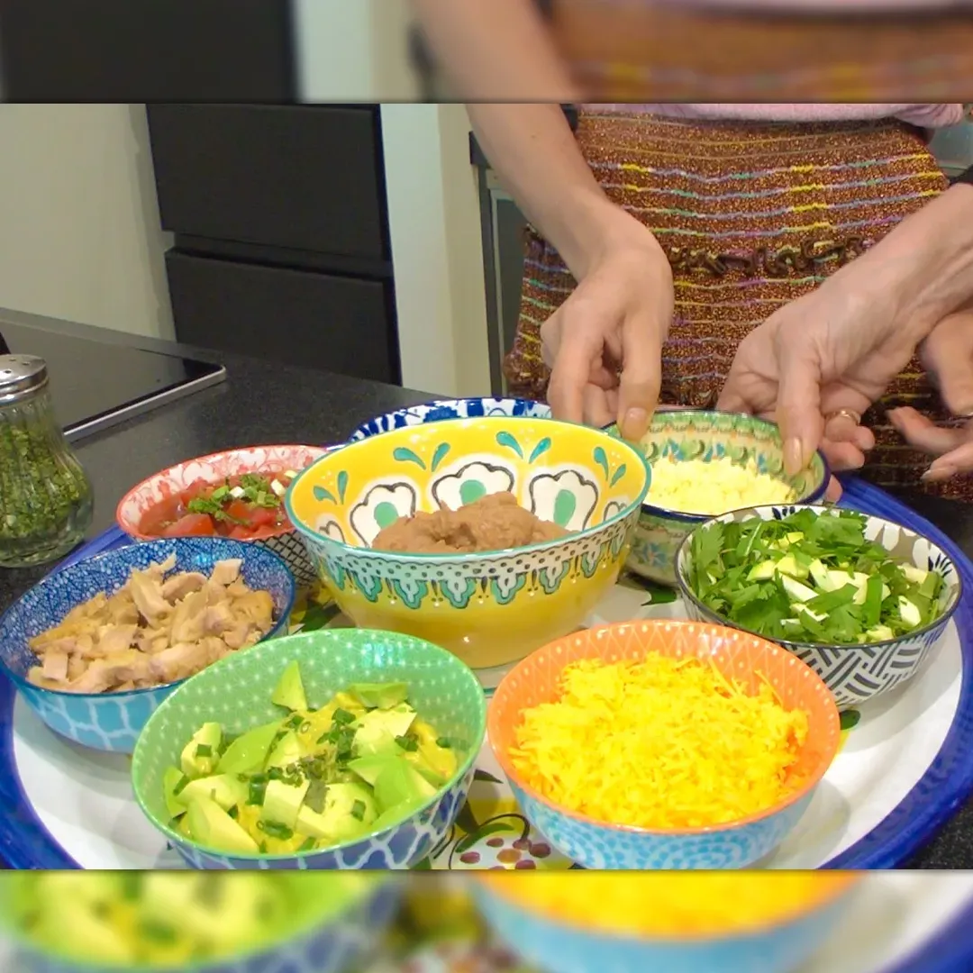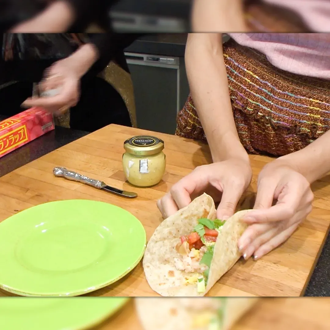 ②市販のトルティーヤに好みの食材やソースをのせ、巻いたら完成!