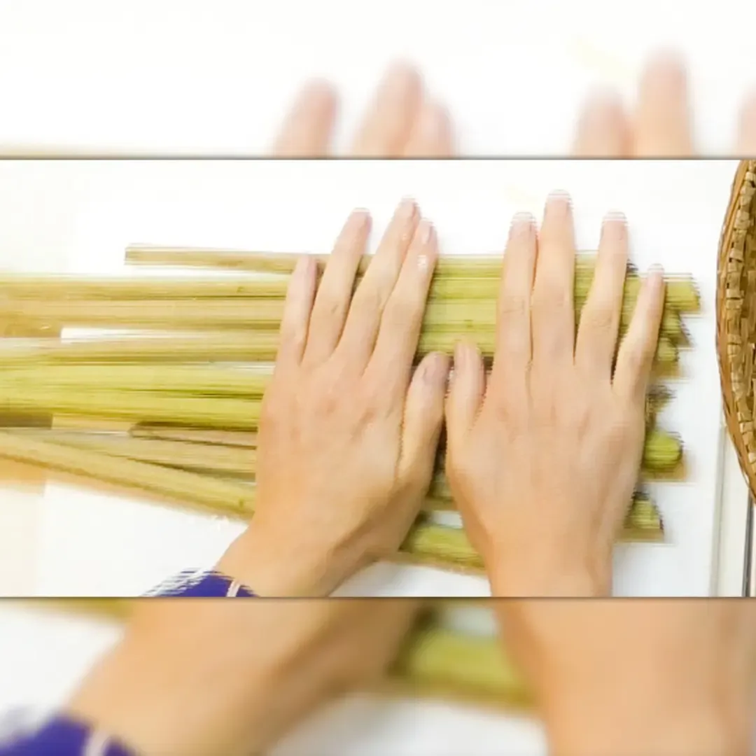 ①葉をとったくきをまな板の上に置き、塩をふり両手でゴロゴロと板ずりする