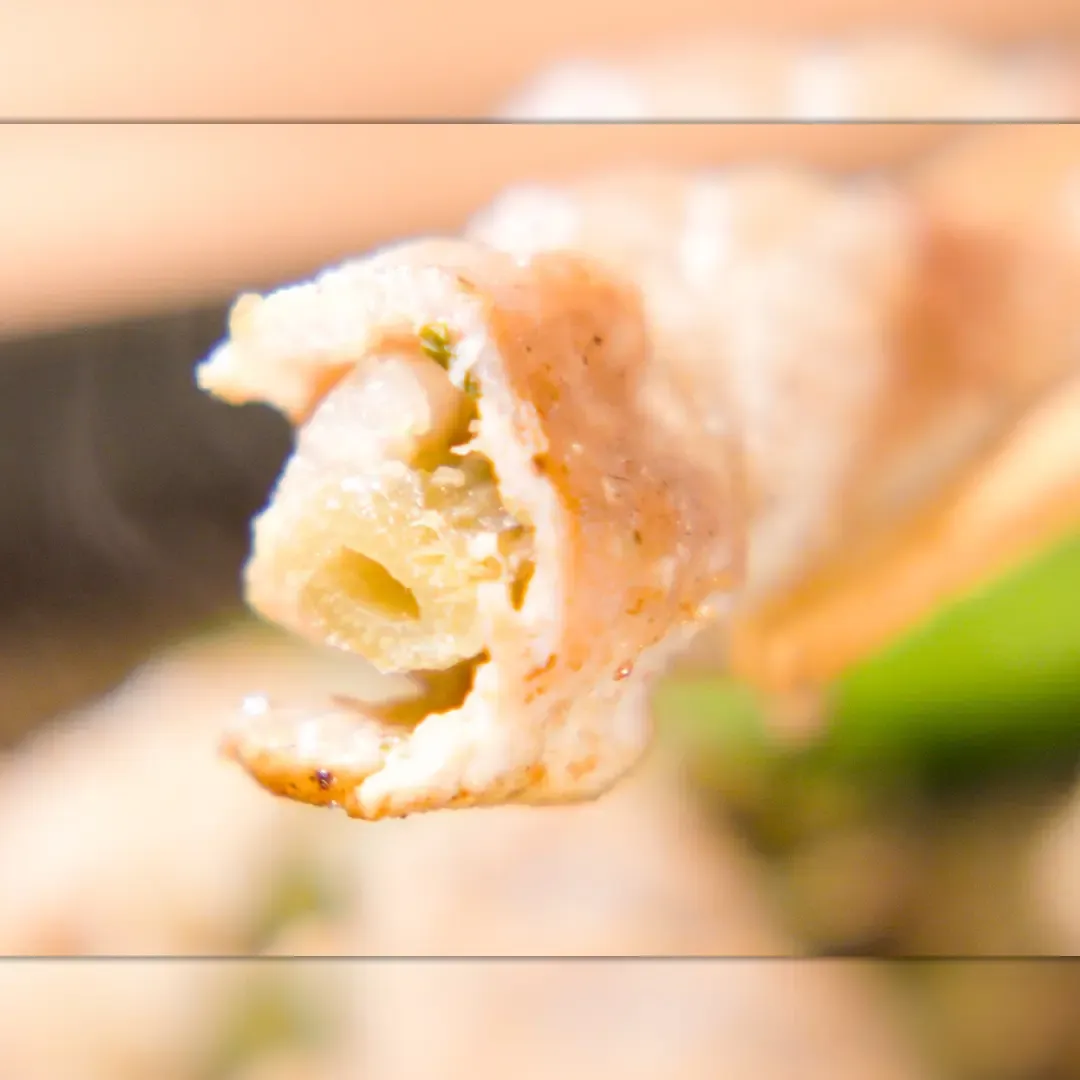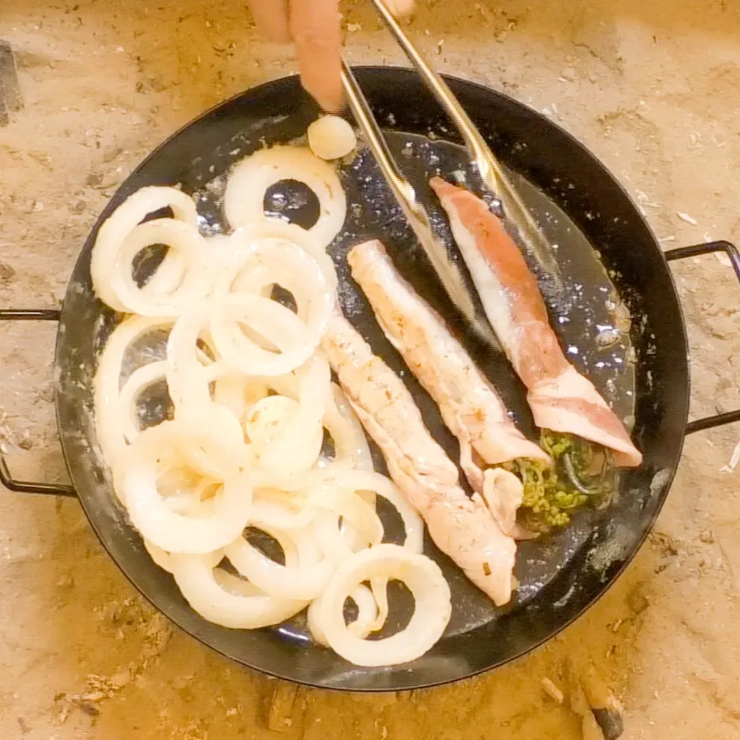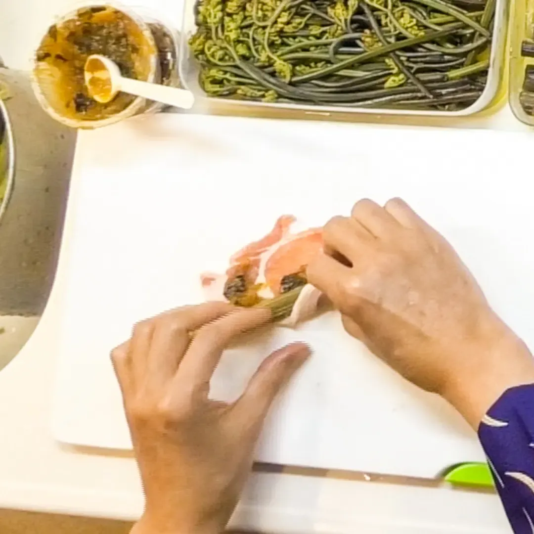 ②フキやわらびを豚ロース(豚バラ・ベーコンでも OK)で巻き、塩コショウをふる