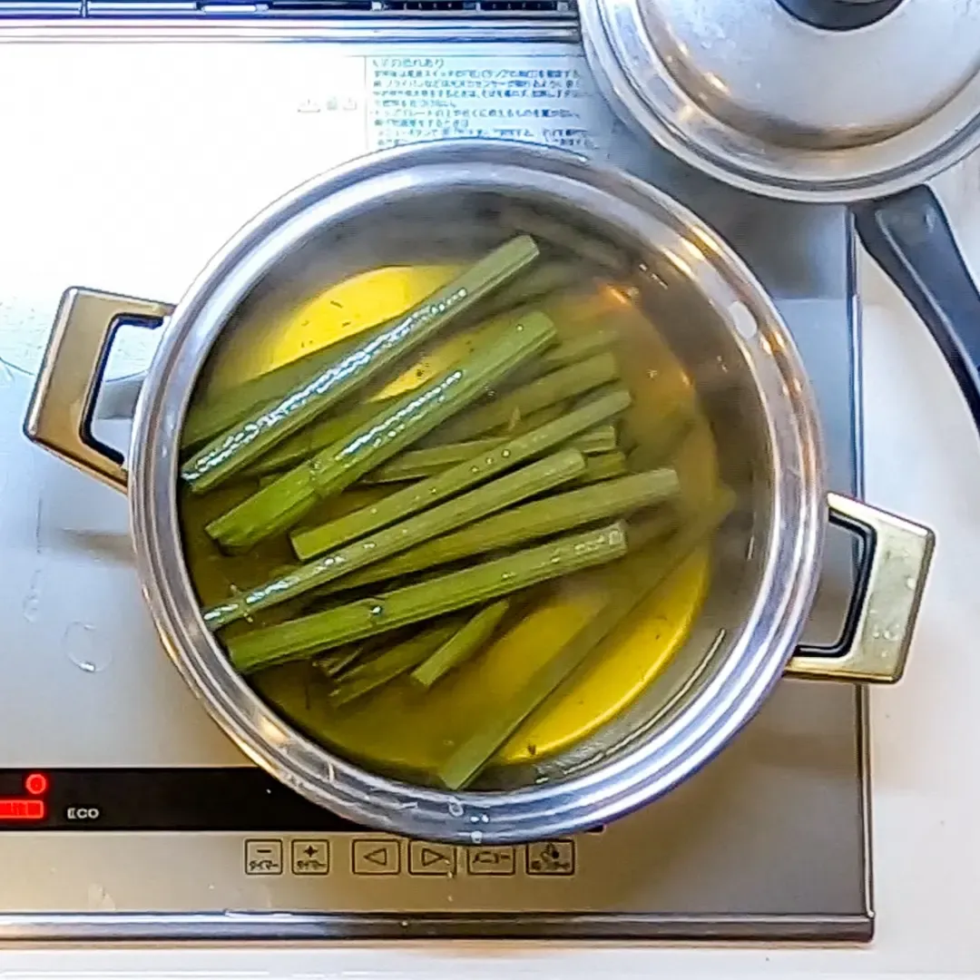 ②お湯が沸騰したら重曹を加え、塩がついたままフキを入れ 5 分程茹でる