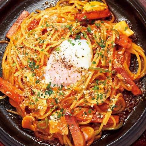 ホテルニューオータニ『SATSUKI』のナポリタン 鉄板焼き 温泉卵添えは、“じゅうじゅう”と食欲をかきたてる音がたまりません!