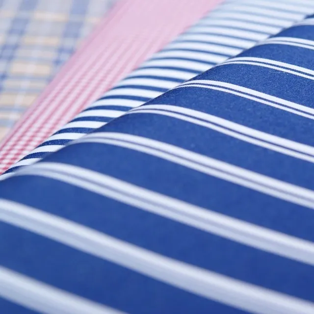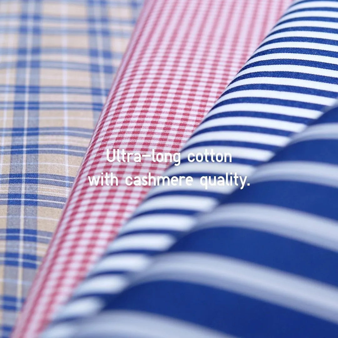 This fabric is soft with a smooth sheen and vivid color that comes from the use of hard-to-find ultra-long cotton, which is produced in limited quantities worldwide. We took advantage of these traits to put together 24 patterns with beautiful colors and designs, including solid colors, stripes, and checked. We’ve also adjusted specifications like yarn thickness to fit the color and pattern. A thicker warp for the striped design makes the lines look nicer. For solid colors, we’ve made both the warp and weft thicker so it’s harder to see through the fabric. As you can tell, we’ve meticulously customized each color and pattern.